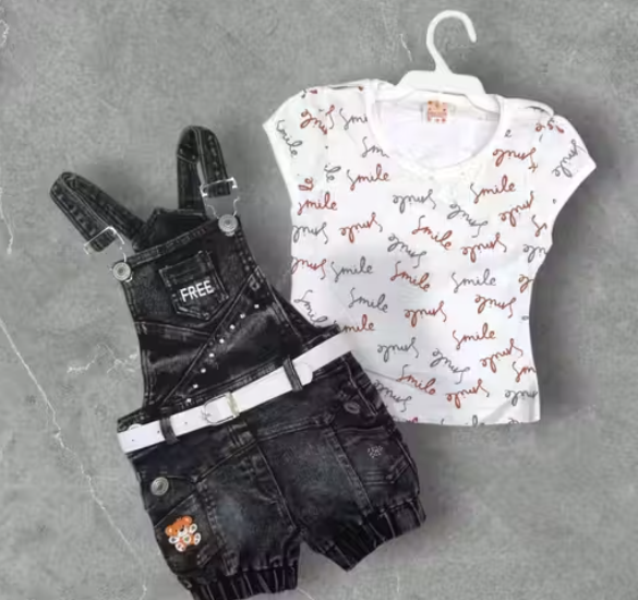 Bublee Dublee Kids Black Denim Dungree with Hosiery Printed Top Half Sleeves Adjustable Straps & Button Closures