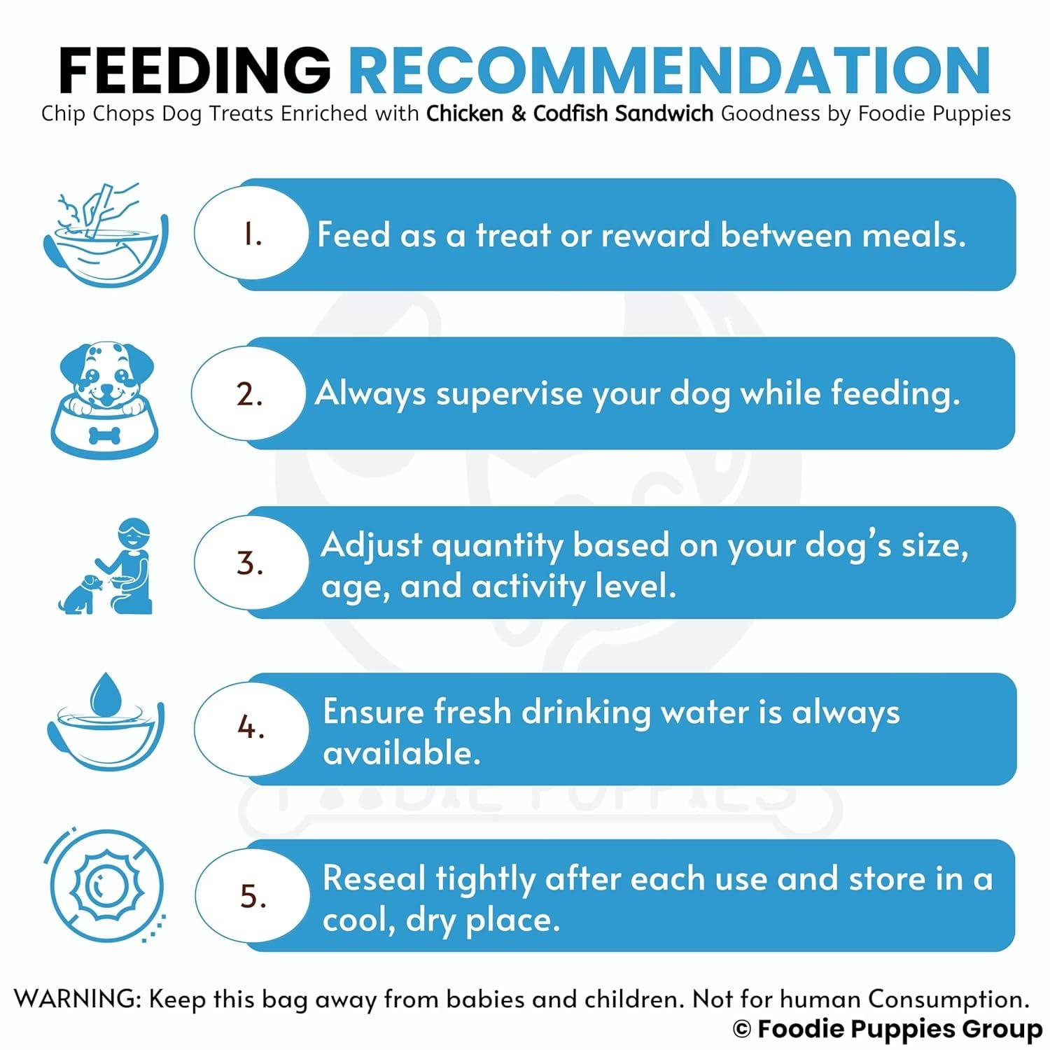 - Foodie Puppies Tips : Reduce the portions served at their regular meal times, to take into consideration the fact they have eaten treats throughout training sessions in a day to help avoid pet obesity in the long run.