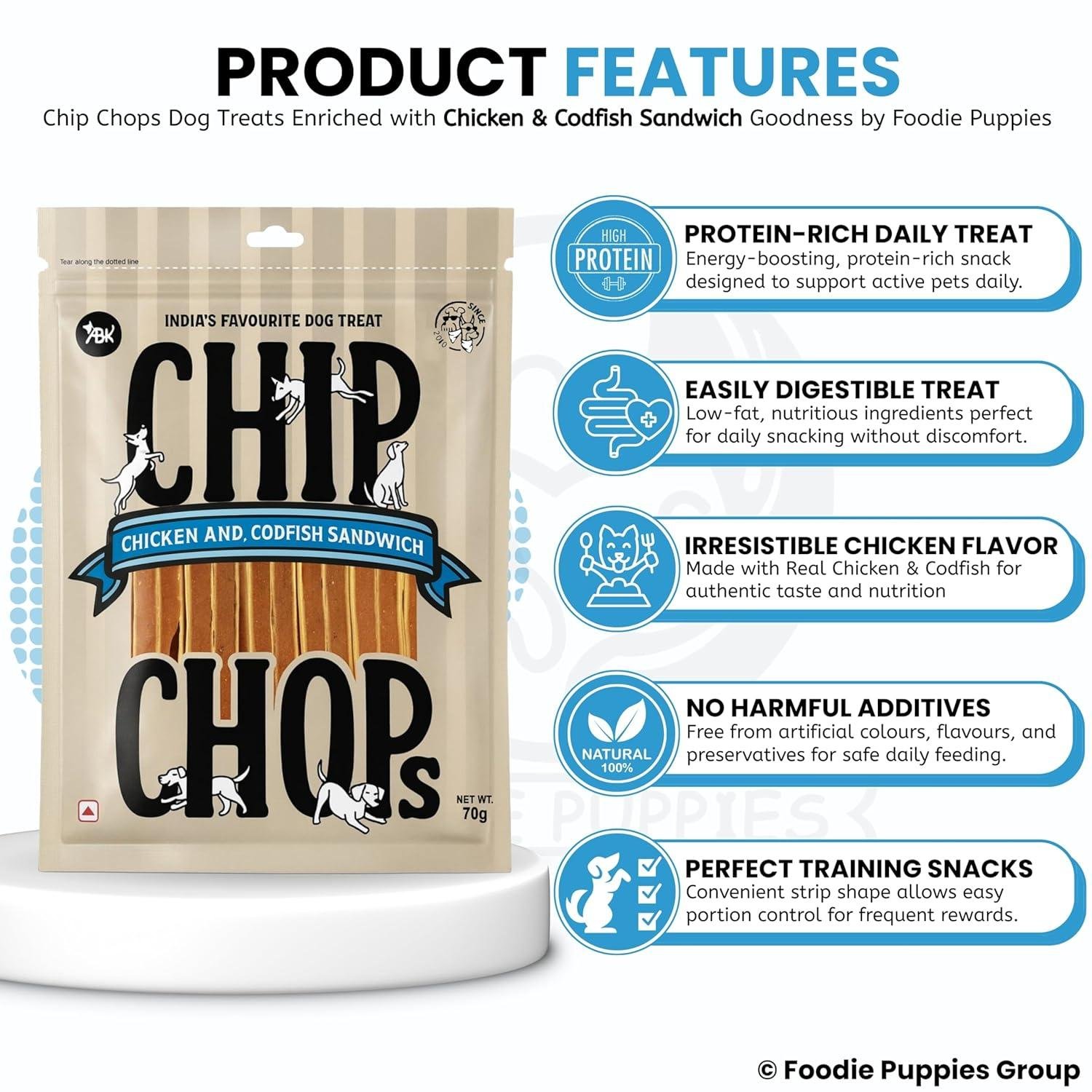 Foodie Puppies Chip Chops snacks are carefully prepared to provide a pure, tasty and highly digestible snack filled with nutritional benefits for pet's well-being. With no added sugar and rich in proteins, these goodies are packed in an easily resealable packet for your convenience. Highly nutritional and digestible, Suitable for all dog breeds Made with no added sugar & Use it as a snack or a treat to reward your pet Packed in an easily resealable packet for your convenience Foodie Puppies Tips : Reduce the portions served at their regular meal times, to take into consideration the fact they have eaten treats throughout training sessions in a day to help avoid pet obesity in the long run It is one such snack; as it is made of fresh meat. This dog snack provides a pure, tasty and highly digestible treat. This treat is filled with nutritional goodness and is suitable for feeding as a snack, rewards for good behaviour and to show your pet love with some indulgent pampering Chip Chops Dog Treats Different Flavours Available with Multi Packs, 70gm (Chicken & Calcium Bone, Pack of 1) with Free Key Ring