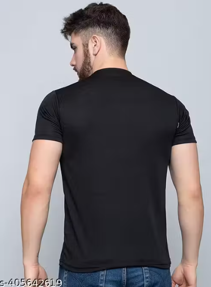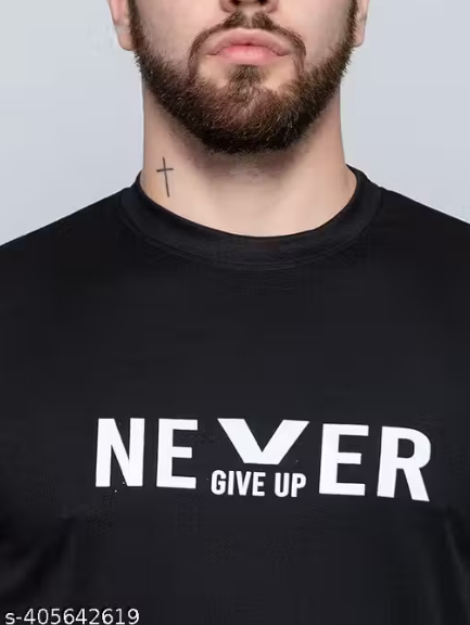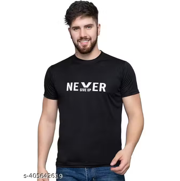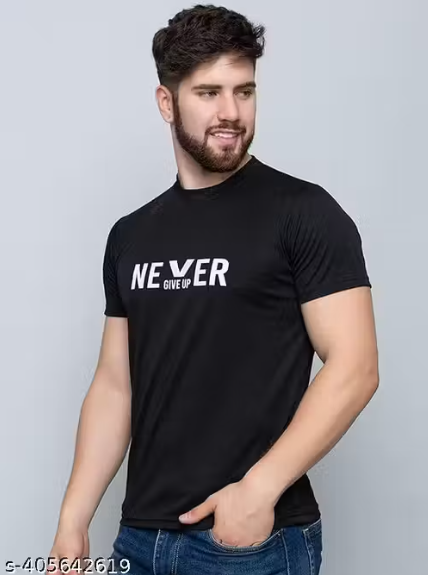 Add a bold edge to your everyday style with this black typography printed T-shirt, designed for comfort and modern appeal. Crafted from lightweight polyester fabric, it offers a smooth feel, durability, and easy maintenance—perfect for daily wear.