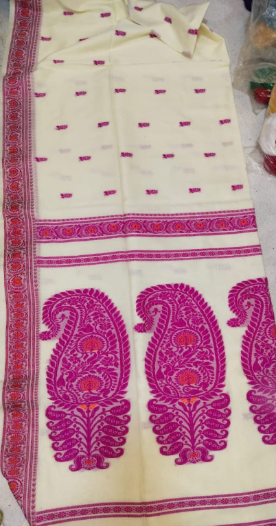 Elevate your ethnic wardrobe with this authentic handmade Baluchari saree, masterfully crafted in soft and breathable cotton maslight fabric. Featuring regal magenta motifs intricately woven over a graceful cream base, this saree embodies the timeless artistry of Bengal’s weaving traditions.