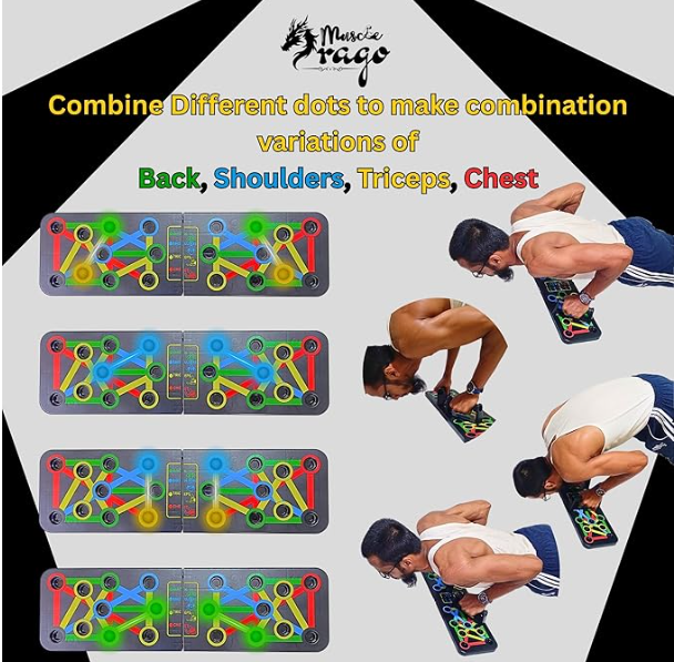 - 2️⃣ MULTI-FUNCTION PUSHUP BOARD FOR CHEST, SHOULDERS & TRICEPS The color-coded pushup board, also known as push up bar, pushup bar, push up board for home, pushup stand, gym pushup board, pushup board for man chest, and 15 in 1 push up stand, helps you target chest, triceps, shoulders and back with precision. The best addition to your home gym setup, gym equipment for home workout, gym items for home workout, and daily exercise equipment.