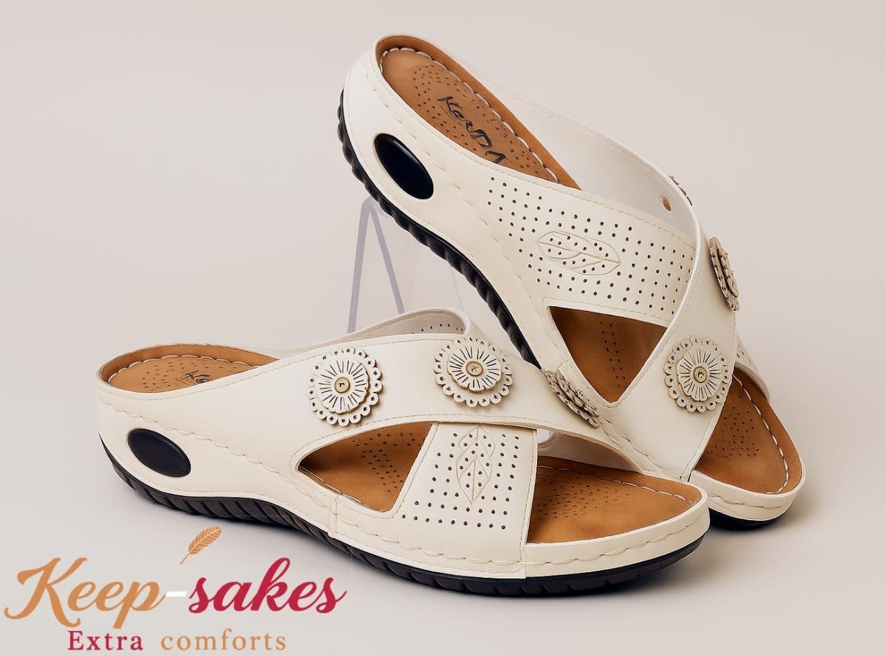 These elegant white women’s sandals are designed for all-day comfort with a stylish touch. Crafted with a soft cushioned footbed, they provide excellent support for daily wear. The perforated upper design allows breathability, keeping feet cool and comfortable. Decorative floral accents add a fancy yet subtle charm, making them perfect for both casual and semi-formal use.