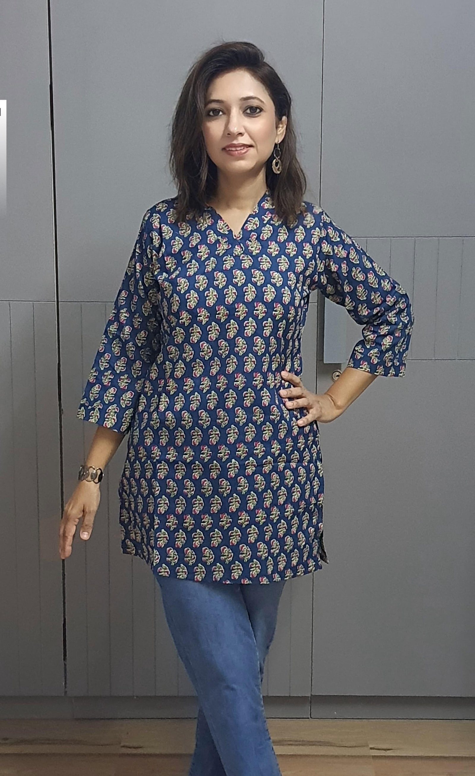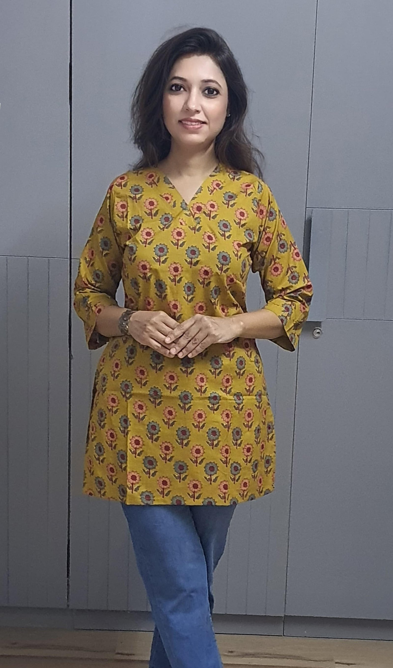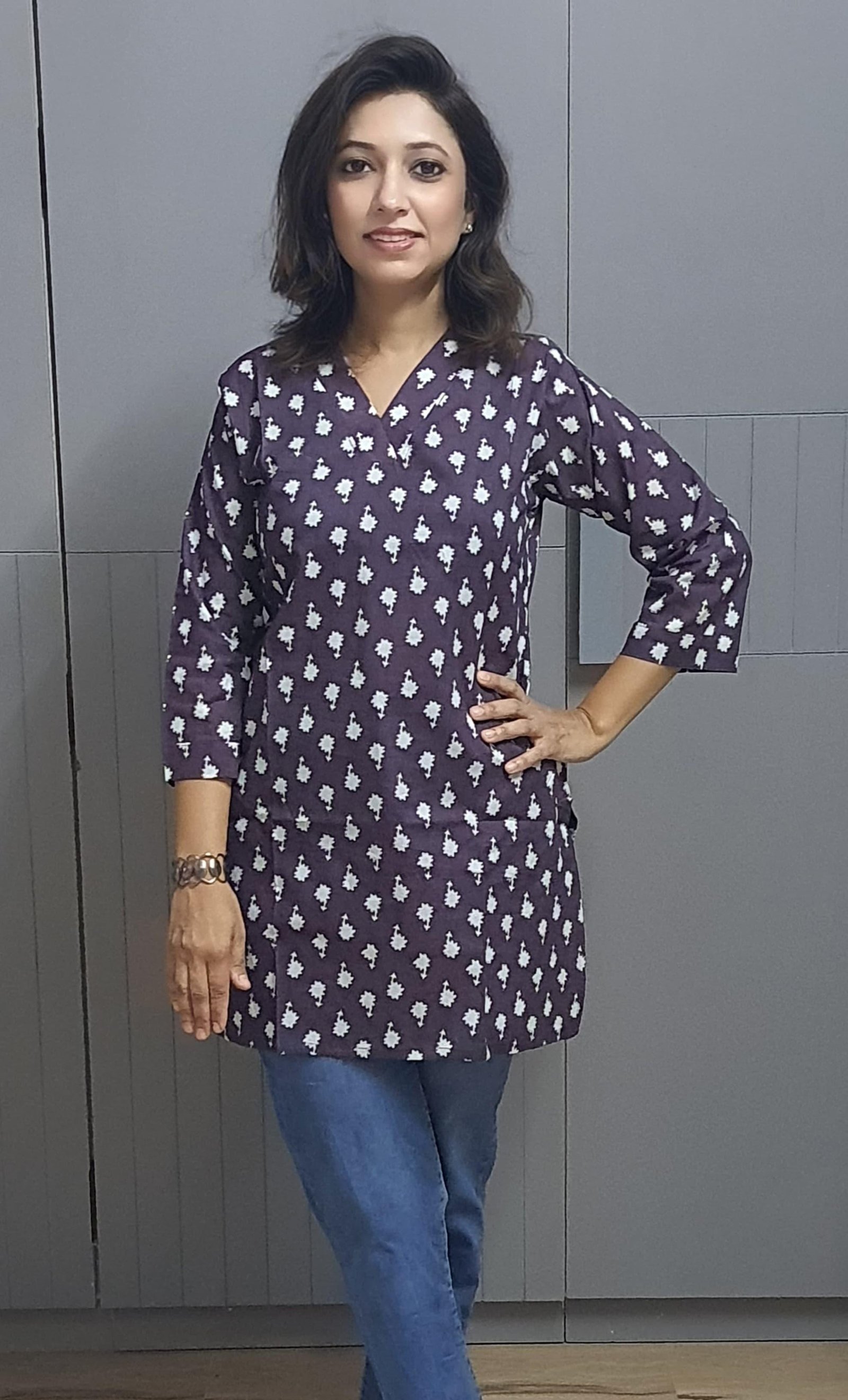 ππ»This tunic is made of pure cotton cambric fabric which gives excellent look. It has 3/4th sleeves with side slit. It has V neck patti pattern.