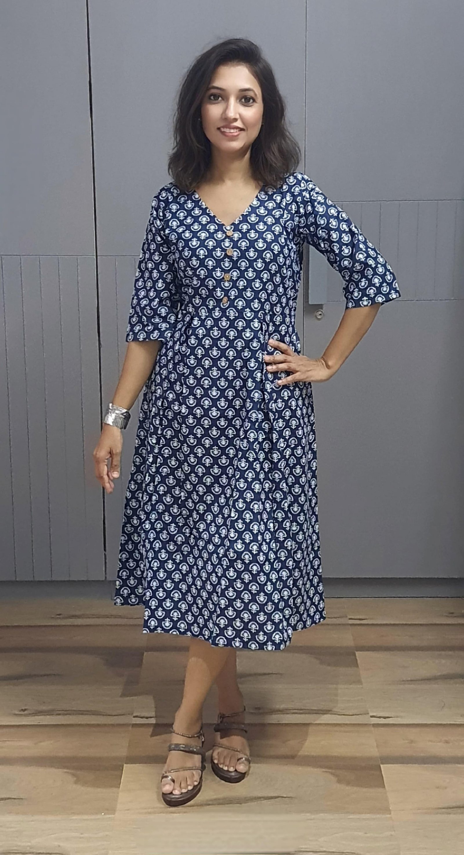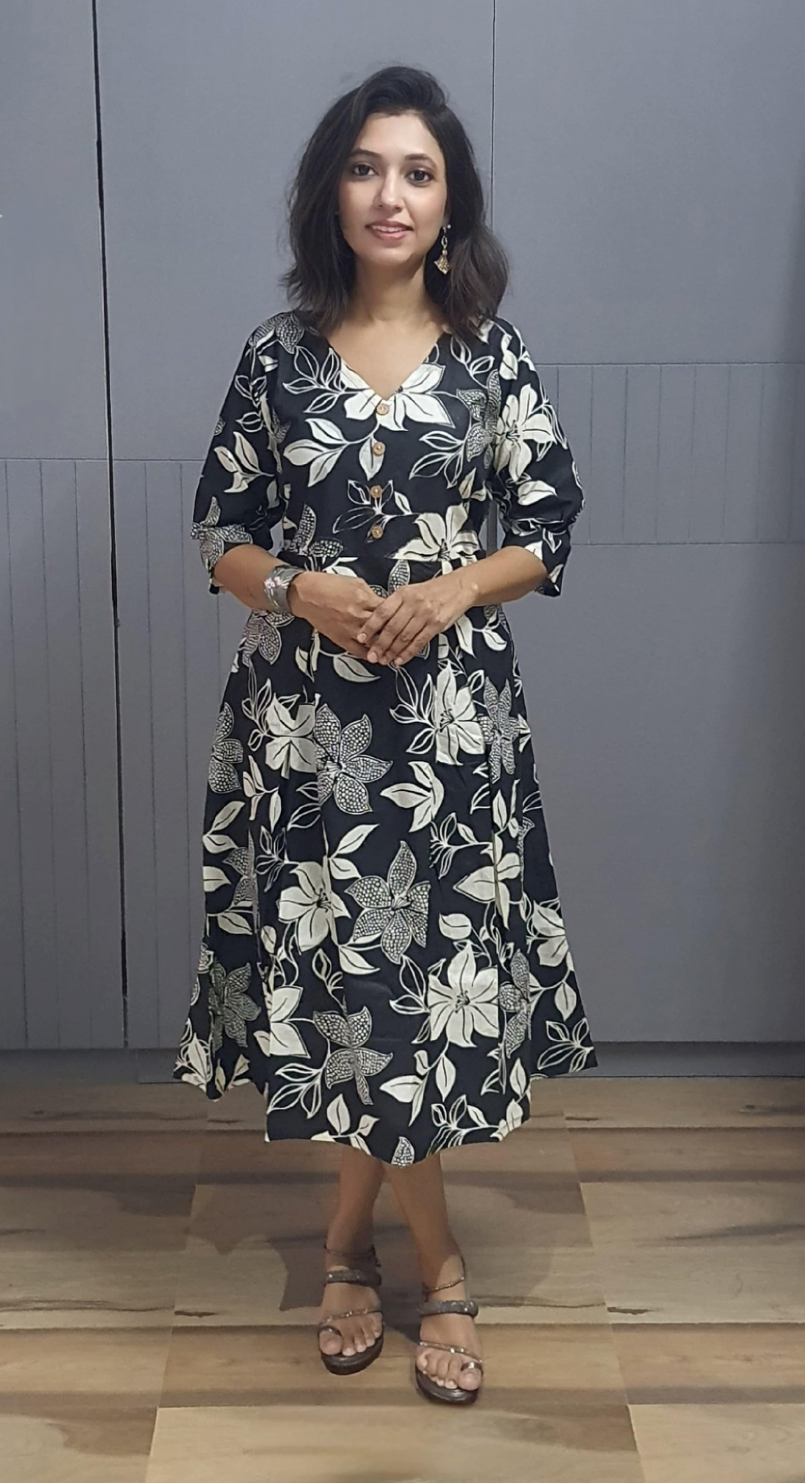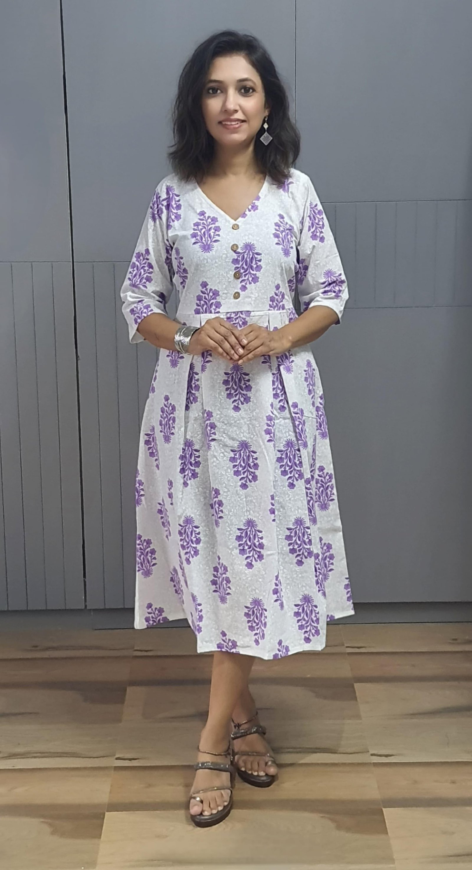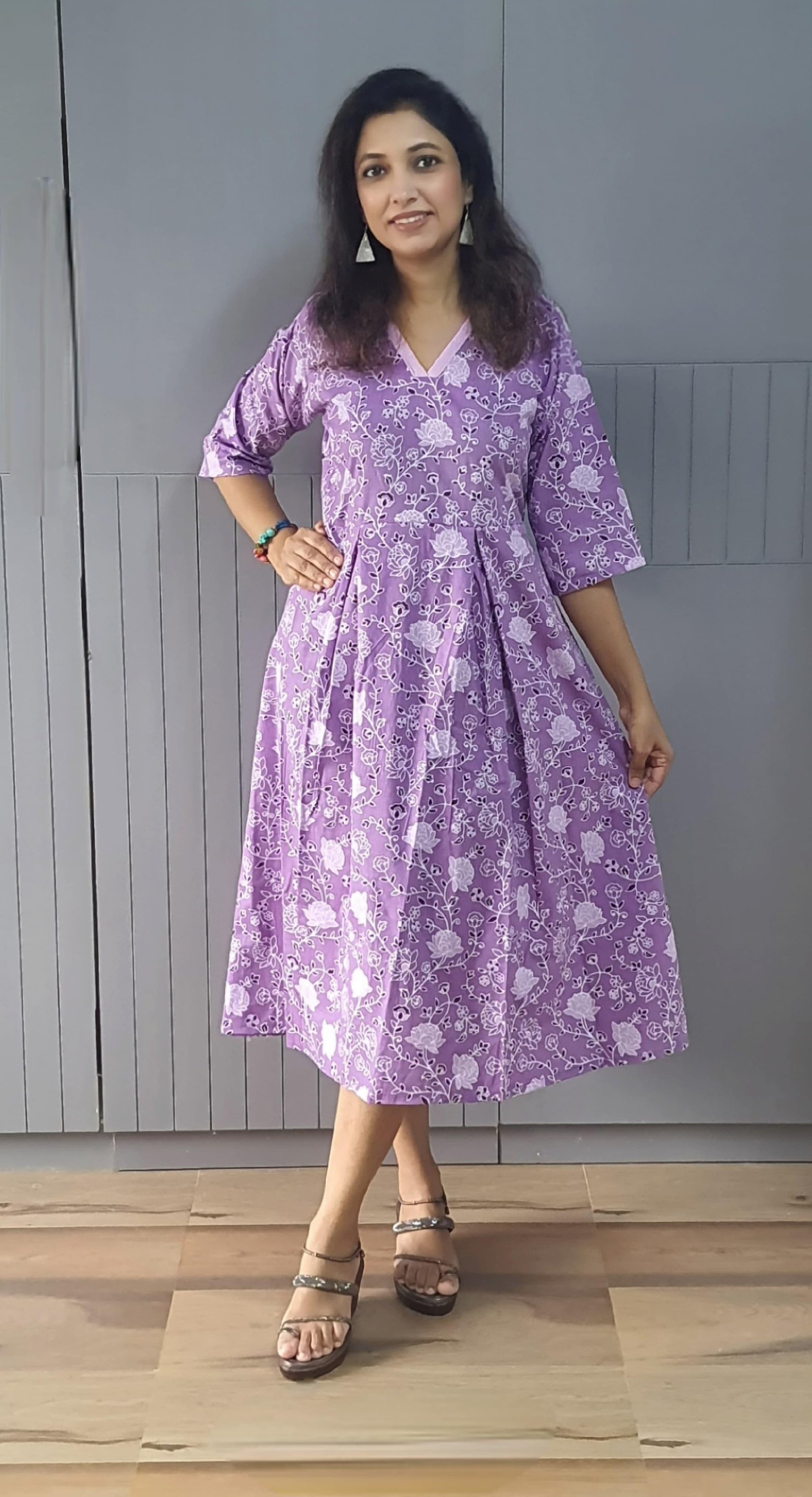 Good quality A-line one piece dress for women. Both sides pleats will give you a classic and trendy look. It has two belts on both sides. It will keep you comfortable all day long.