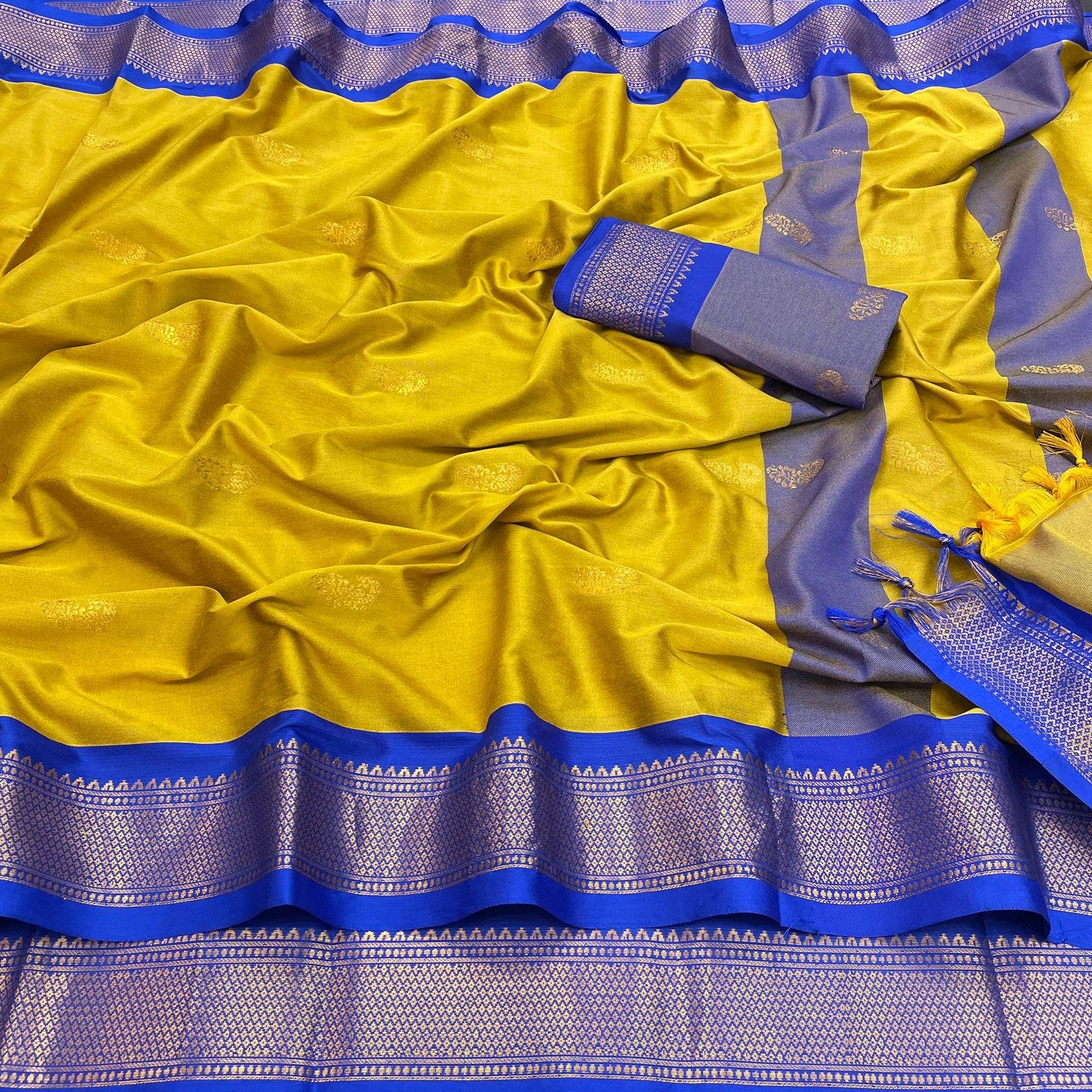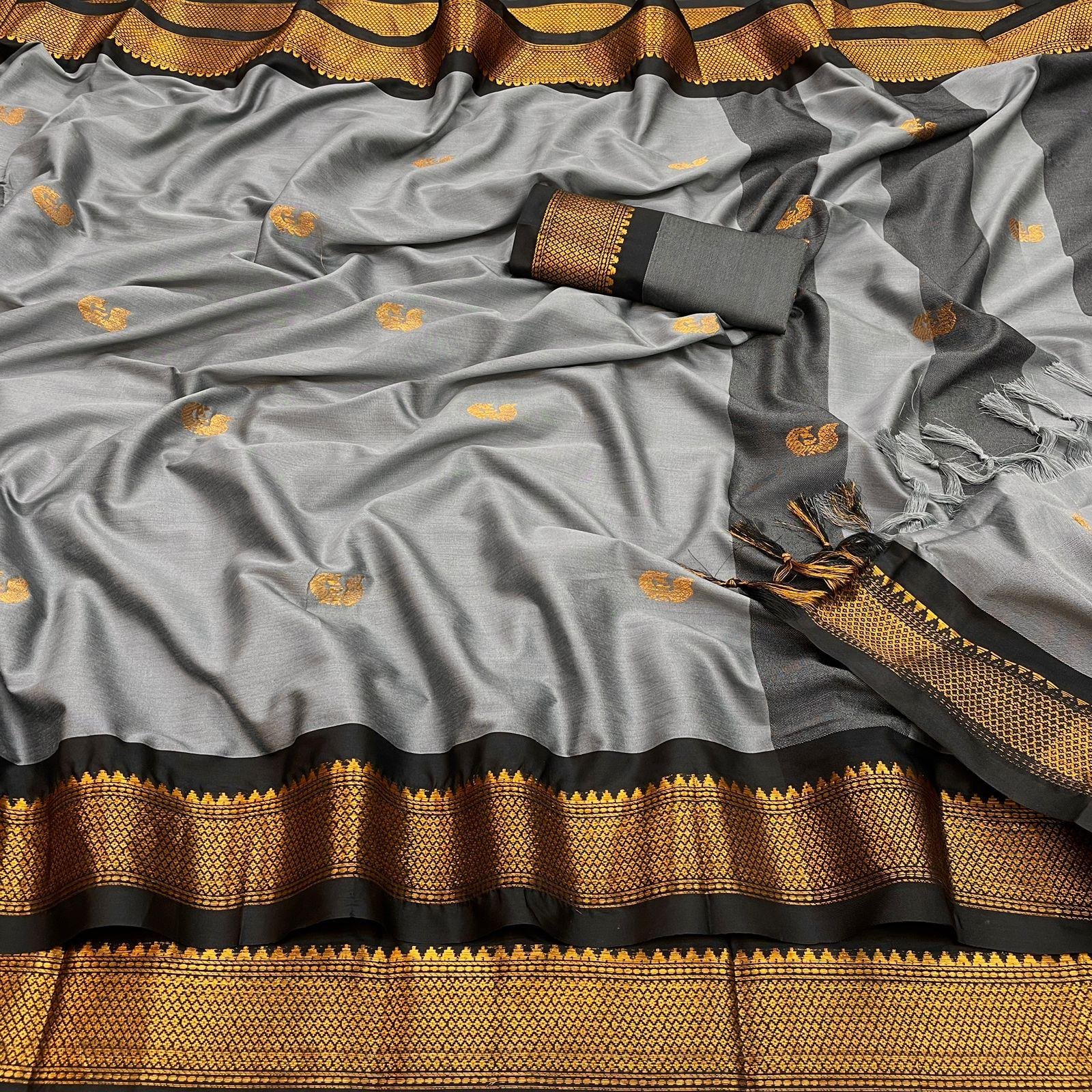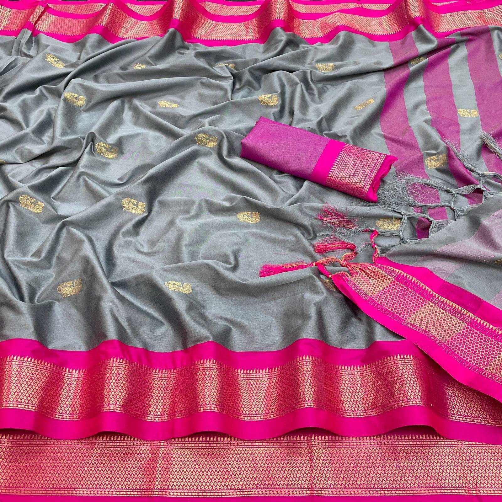 Add a touch of traditional elegance to your wardrobe with this Cotton Silk Saree. Featuring a Pai Thani-inspired border and a contrasting blouse, the saree is enhanced with a Zari border and intricate peacock motifs, giving it a rich and festive look.