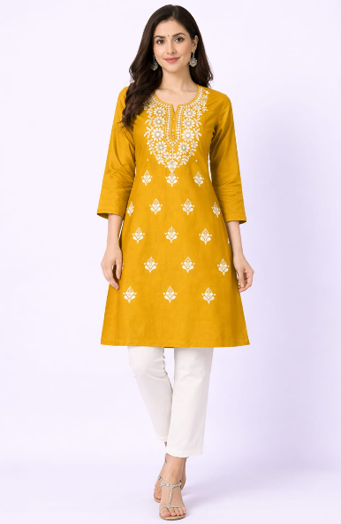Elevate your everyday ethnic wear with this elegant CPMPUER Chikankari Rayon Kurti. Crafted from soft and breathable rayon fabric, this kurti features beautiful Chikankari embroidery that adds a touch of traditional charm. The comfortable round neck and 3/4th sleeves make it perfect for daily wear, office wear, or casual outings.