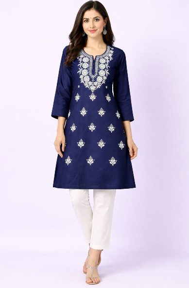 CPMPUER CHIKANKARI RAYON KURTI ROUND NECK 3/4TH SLEEVE .46INCH LENGTH
