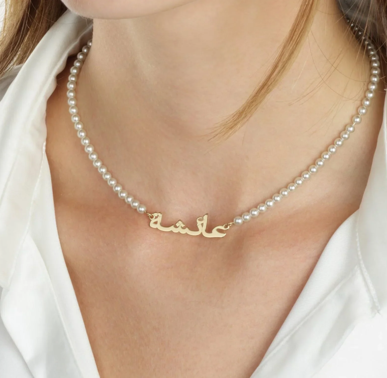 Elevate your jewelry collection with this exquisite custom Arabic name necklace, expertly crafted to showcase your heritage with refined elegance. Each piece features your personalized Arabic name rendered in graceful calligraphy, complemented by lustrous pearls that add timeless sophistication. The combination of intricate metalwork and luminous pearl accents creates a striking focal point that celebrates cultural identity while maintaining contemporary appeal. Perfect for meaningful gifts or personal adornment, this necklace merges traditional artistry with modern design sensibilities. Wear a piece that tells your story with understated luxury and authentic craftsmanship.