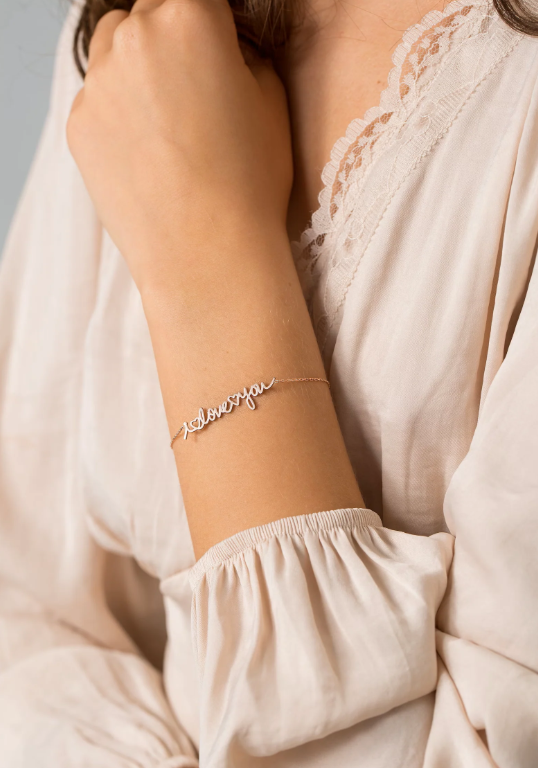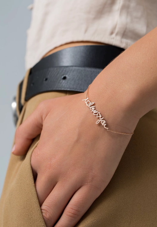 This personalized gold bracelet features a dainty name charm with custom handwriting, making it the perfect gift for any mom. Handmade with care, this unique piece of jewelry is a beautiful way to keep loved ones close. A thoughtful and sentimental gift that will be treasured always.