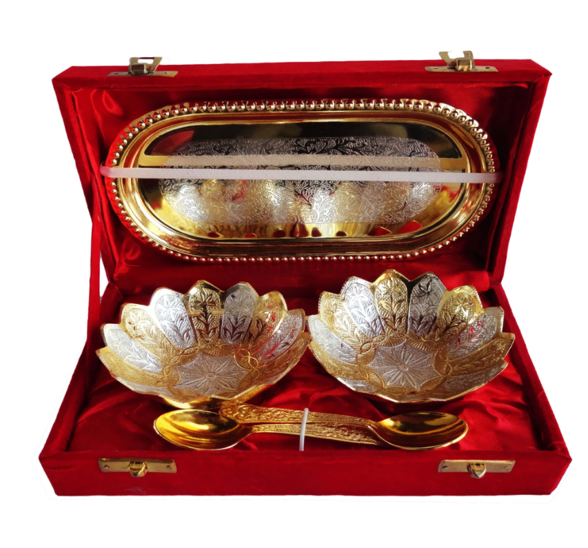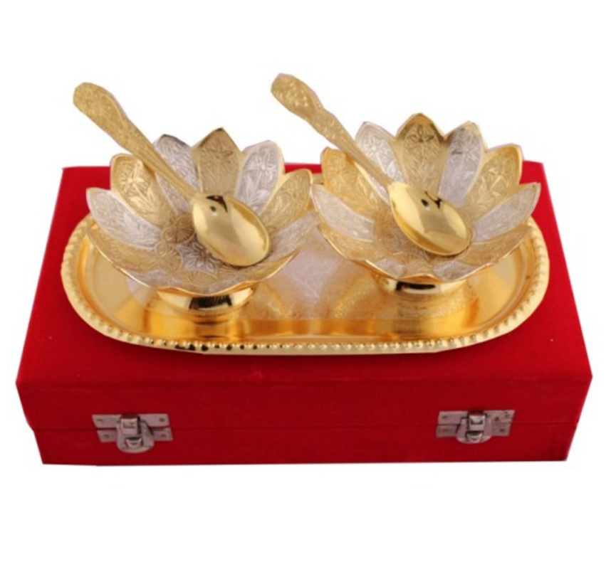 Decorative Silver & Gold Plated 2 Bowl With Tray And Two Spoon
