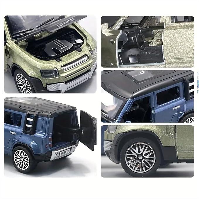 - Introducing the 1:36 Diecast Metal Scale Model of the Land Rover Defender – an exquisite replica that brings the spirit of adventure to your fingertips. This intricately designed model features front openable doors, allowing you to peer into the meticulously recreated interior, while the bonnet lifts to reveal a detailed engine bay for an added touch of realism. The rear door opens, completing the immersive experience.;