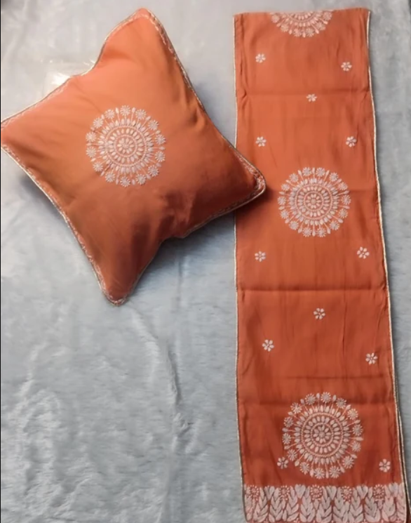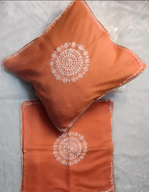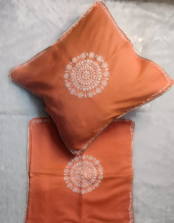 DEVI Orange Chanderi Cusion Chikankari Cover With Runner