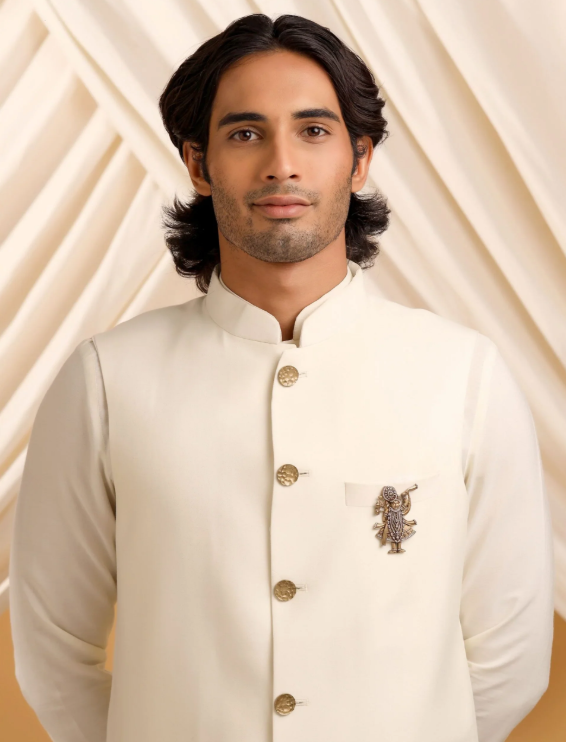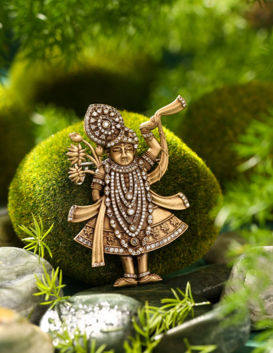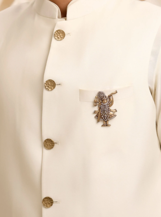 Celebrate cultural heritage with the Divine Shrinathji Brooch, featuring an intricate depiction of a deity figure in traditional attire, adorned with radiant stones. Lightweight and elegantly designed, this brooch can be easily stitched onto coats, jackets, or bandhagalas, adding a touch of spiritual grace and artistic flair to any formal outfit. Ideal for those who appreciate the fusion of tradition and contemporary fashion