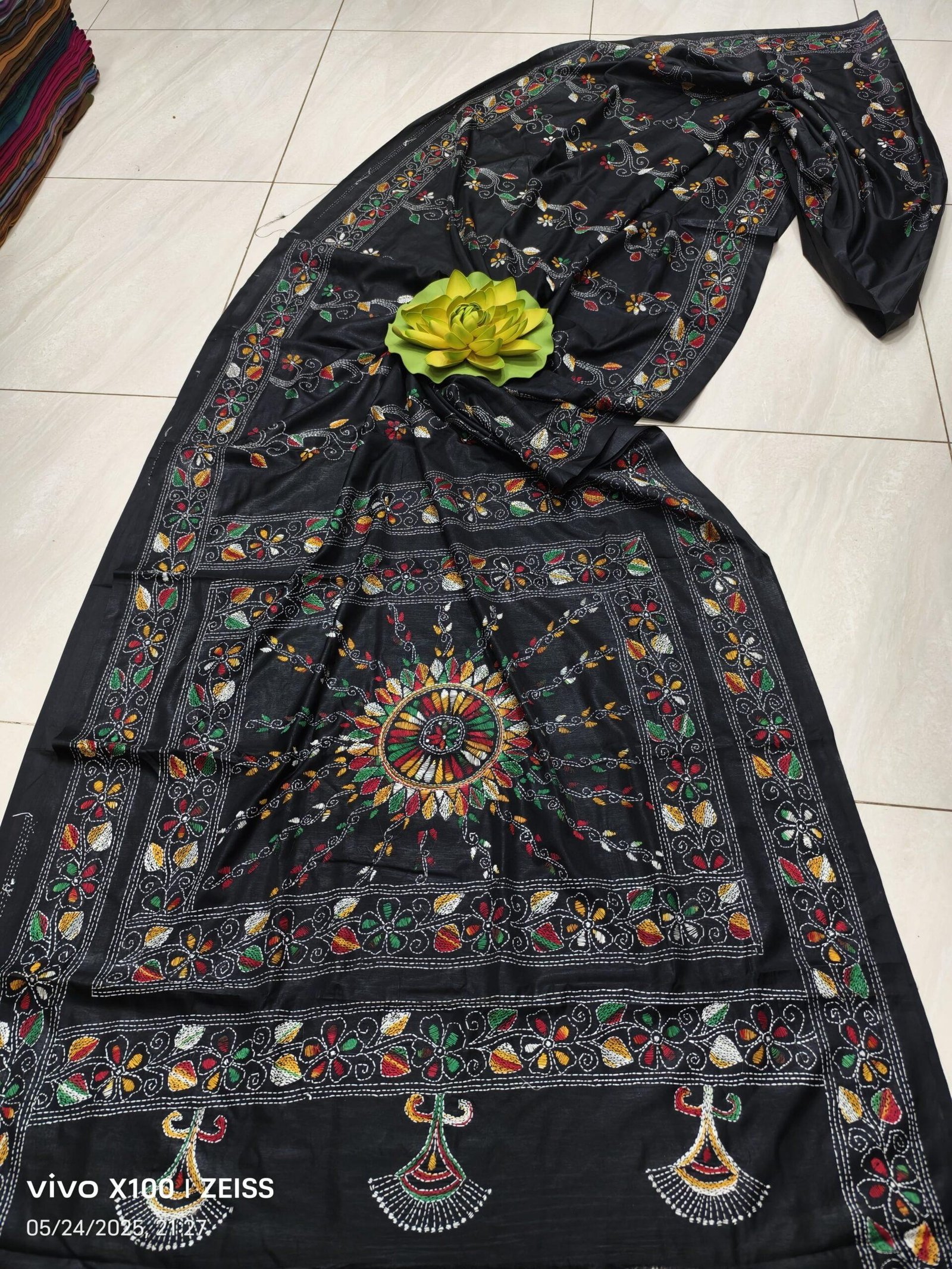 Celebrate tradition with a bold twist in this luxurious black Assam Silk saree, adorned with exquisitely detailed Kantha embroidery in a vibrant spectrum of colors. Each stitch is handwoven with care, transforming the deep silk base into a canvas of living heritage and artistry.