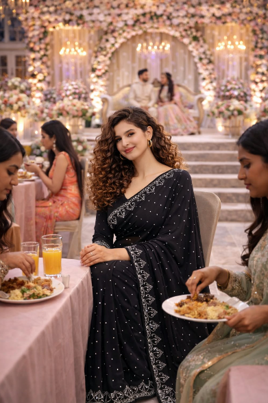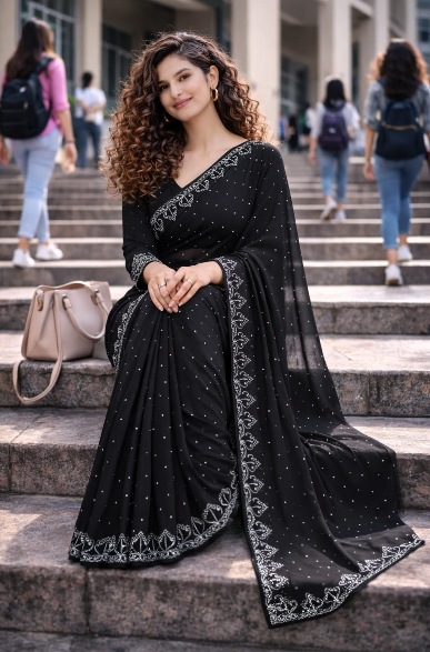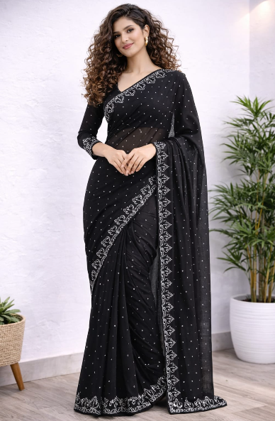 Add timeless elegance to your wardrobe with this Elegant Black Embroidered Party Wear Saree. Designed with delicate embroidery and subtle stone detailing, this saree offers a graceful and sophisticated look. The rich black color enhances its charm, making it perfect for parties, weddings, festive occasions, and evening events. Pair it with statement jewelry for a stunning traditional appearance.
