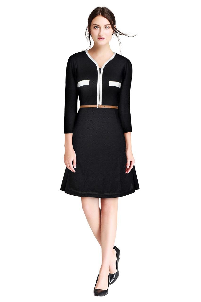 Upgrade your wardrobe with this sophisticated black A-line dress designed for timeless elegance and everyday comfort. Featuring stylish contrast white trim along the neckline and decorative pocket accents, this dress offers a modern and polished look perfect for work, casual outings, or semi-formal occasions.