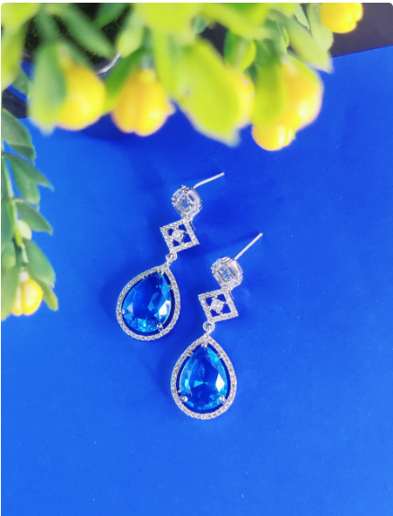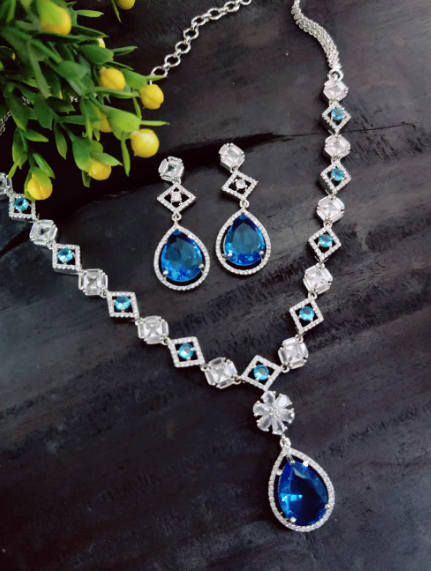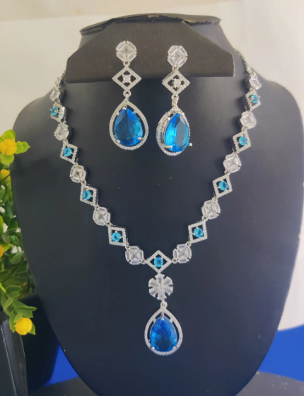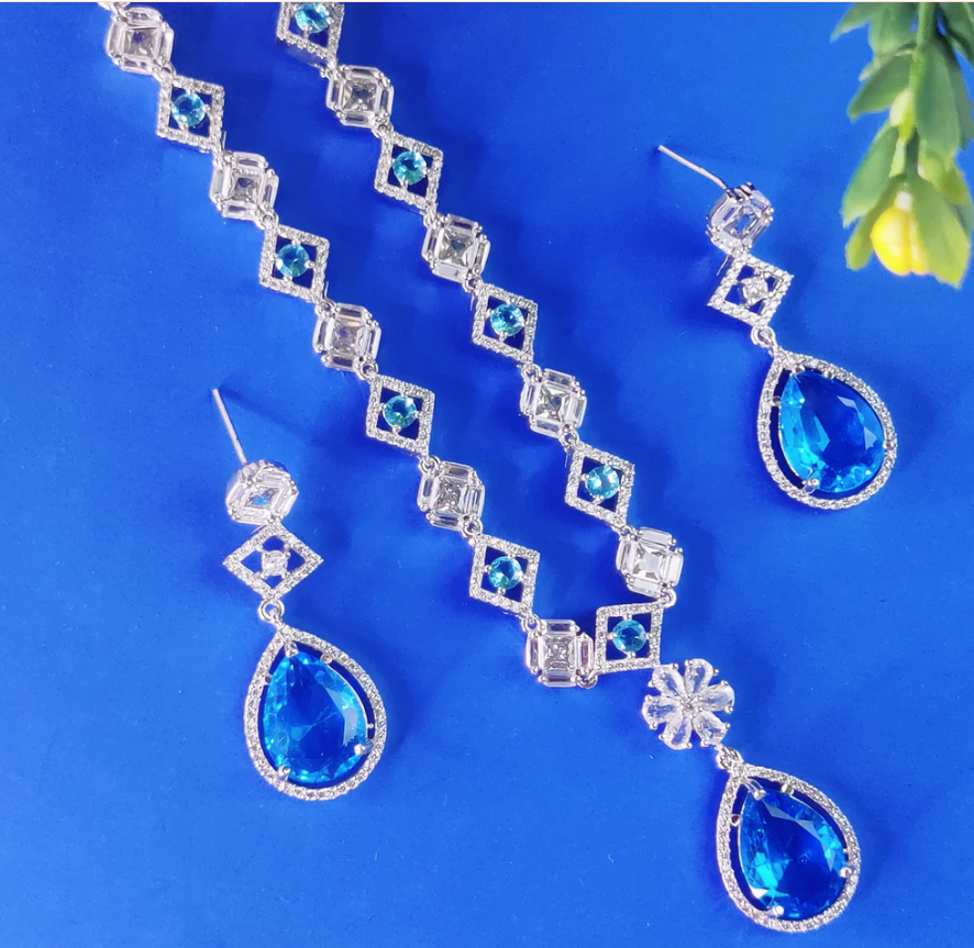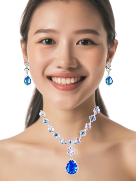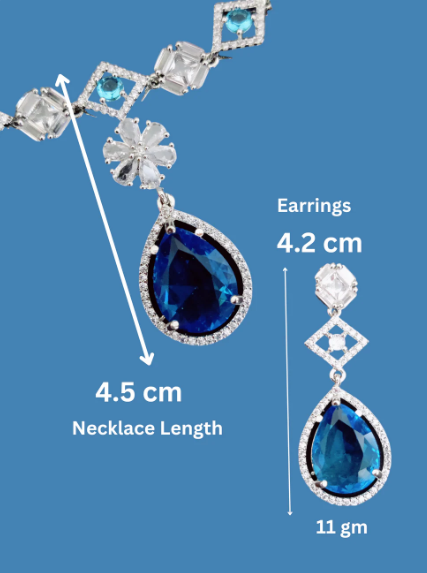Elevate your elegance with this luxurious royal blue teardrop necklace and earring set. The centerpiece features a mesmerizing teardrop-shaped blue stone, perfectly encased in a dazzling silver-toned frame. The necklace is intricately designed with alternating square and diamond-shaped links, each adorned with sparkling clear and blue stones, creating a sophisticated and timeless look.