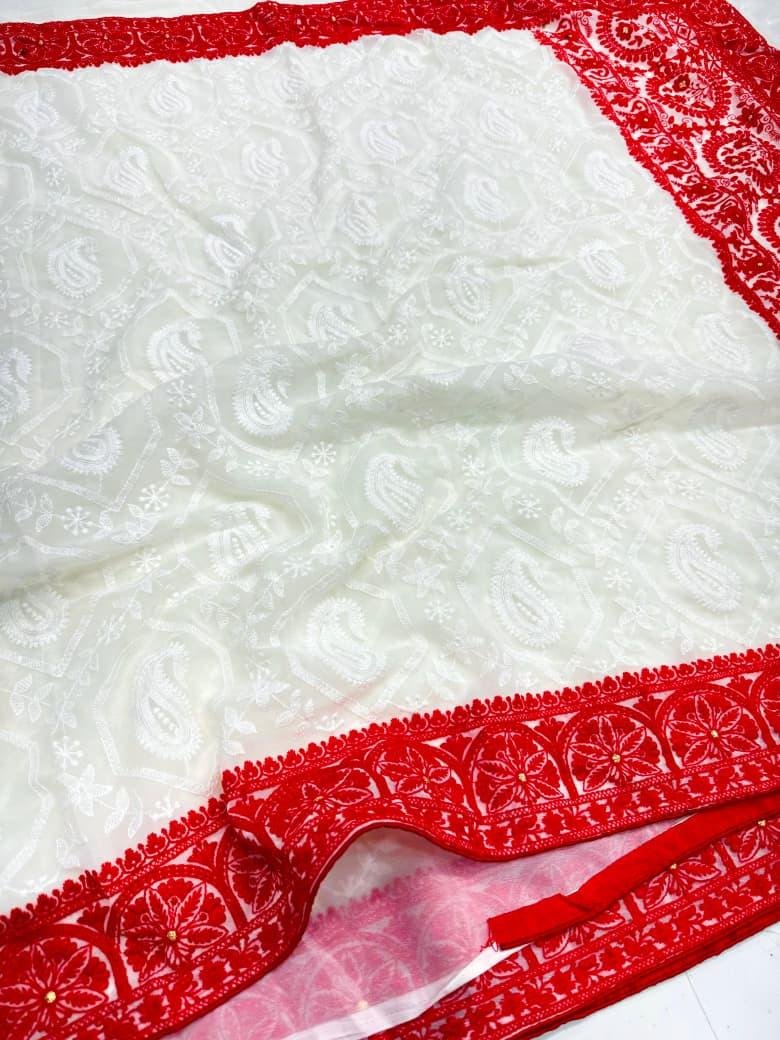 Elegant White & Red Handcrafted Pure Chiffon Lucknowi Chikankari Saree with Blouse Piece