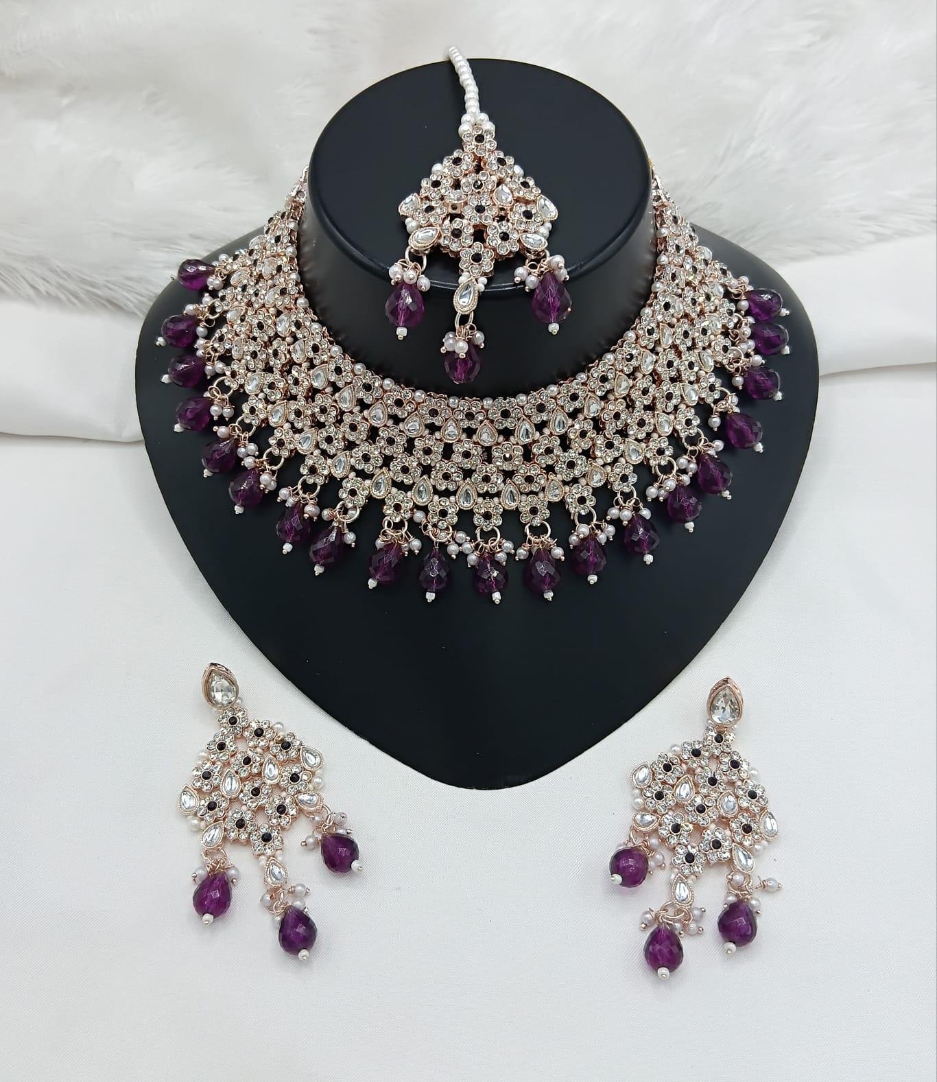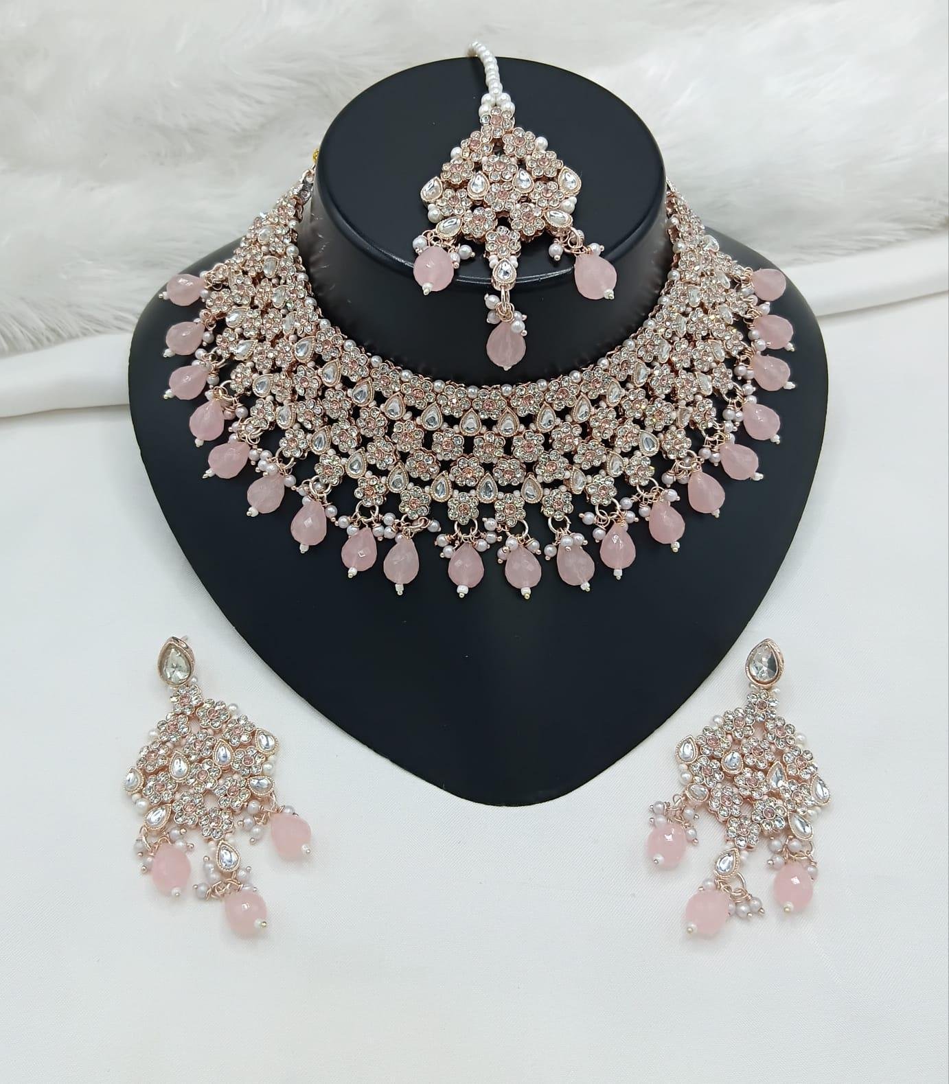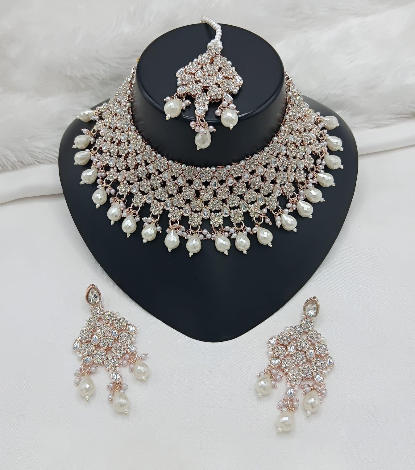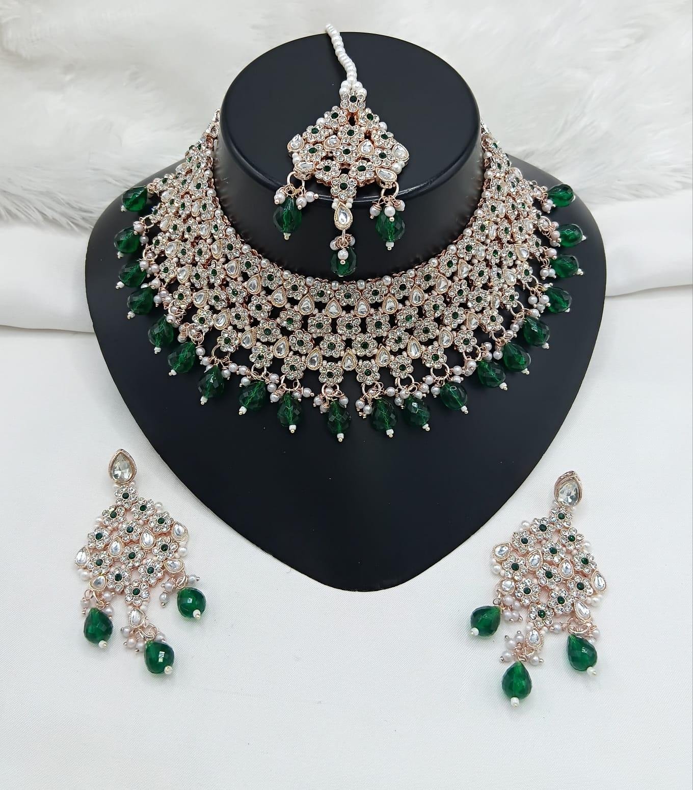 The Emerald Grace Kundan Bridal Necklace Set is a breathtaking blend of traditional artistry and royal sophistication. Designed in a wide choker style, this necklace is adorned with finely set kundan stones and delicate crystal accents, beautifully highlighted by rich emerald-green bead drops that add elegance and depth. The intricate lattice design creates a luxurious, statement look. The set is completed with matching chandelier earrings and a coordinated maang tikka, making it an ideal choice for brides and grand festive occasions.