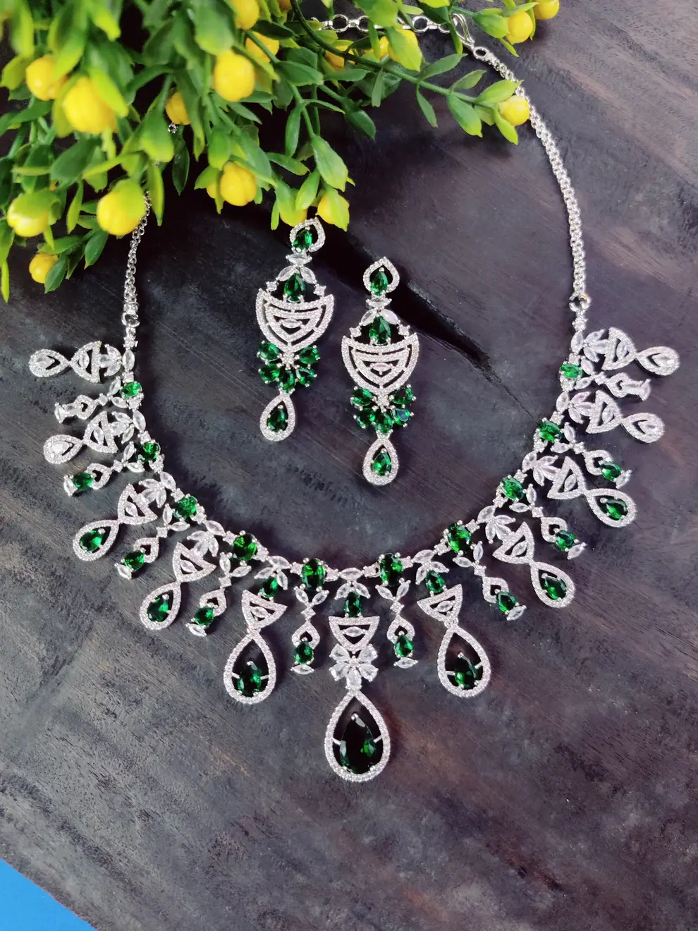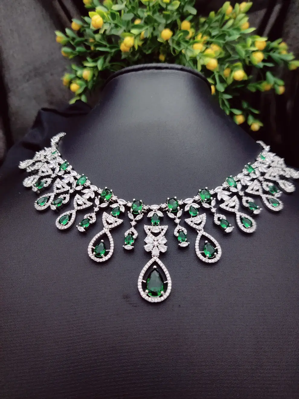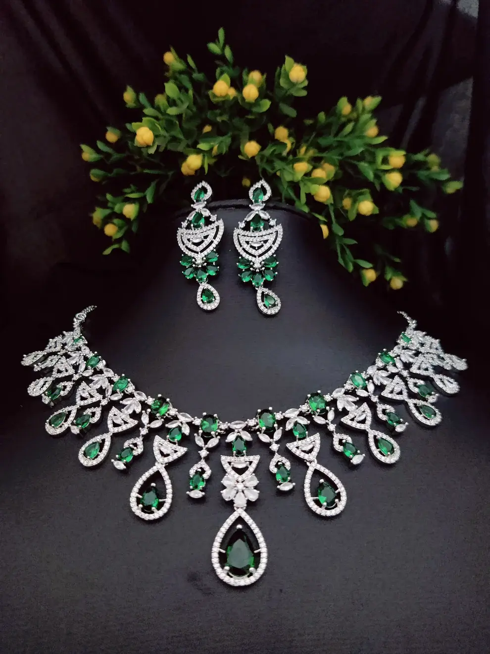 Elevate your look with this stunning necklace and earrings set, adorned with dazzling green stones and intricate diamond-like detailing. This piece features teardrop-shaped emerald-green stones, set in a shimmering silver-tone base, exuding timeless elegance and sophistication. Perfect for weddings, special occasions, or festive celebrations, this set offers a regal touch to any outfit, blending traditional charm with modern allure.