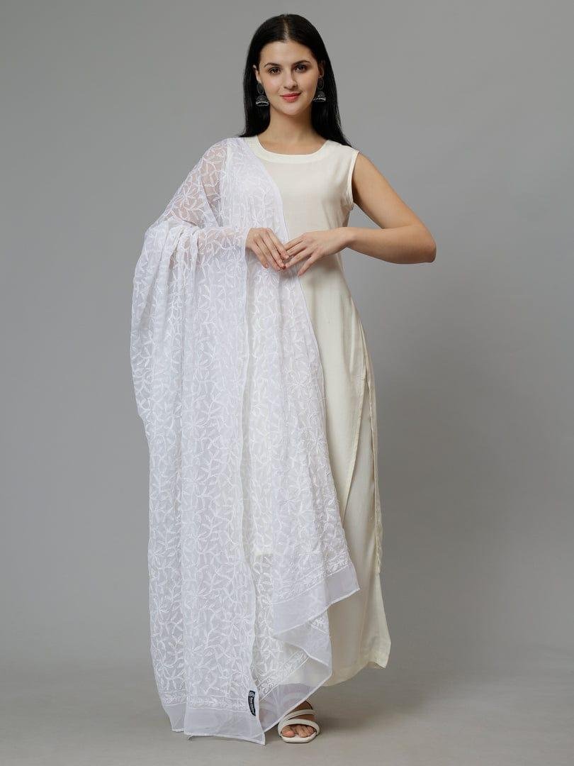 Tapchi duppatta all over jaal work. Fabric: Georgette, Length: 2.5 mtrs. Offers a comfortable and relaxed silhouette to all body types, the fabric and embroidery is skin friendly. Disclaimer: This product is hand embroidered and may have slight dissimilarities that are a natural outcome of the human touch in the process. These minor variations of stitches/motifs add to its charm and ensure you have a unique product.