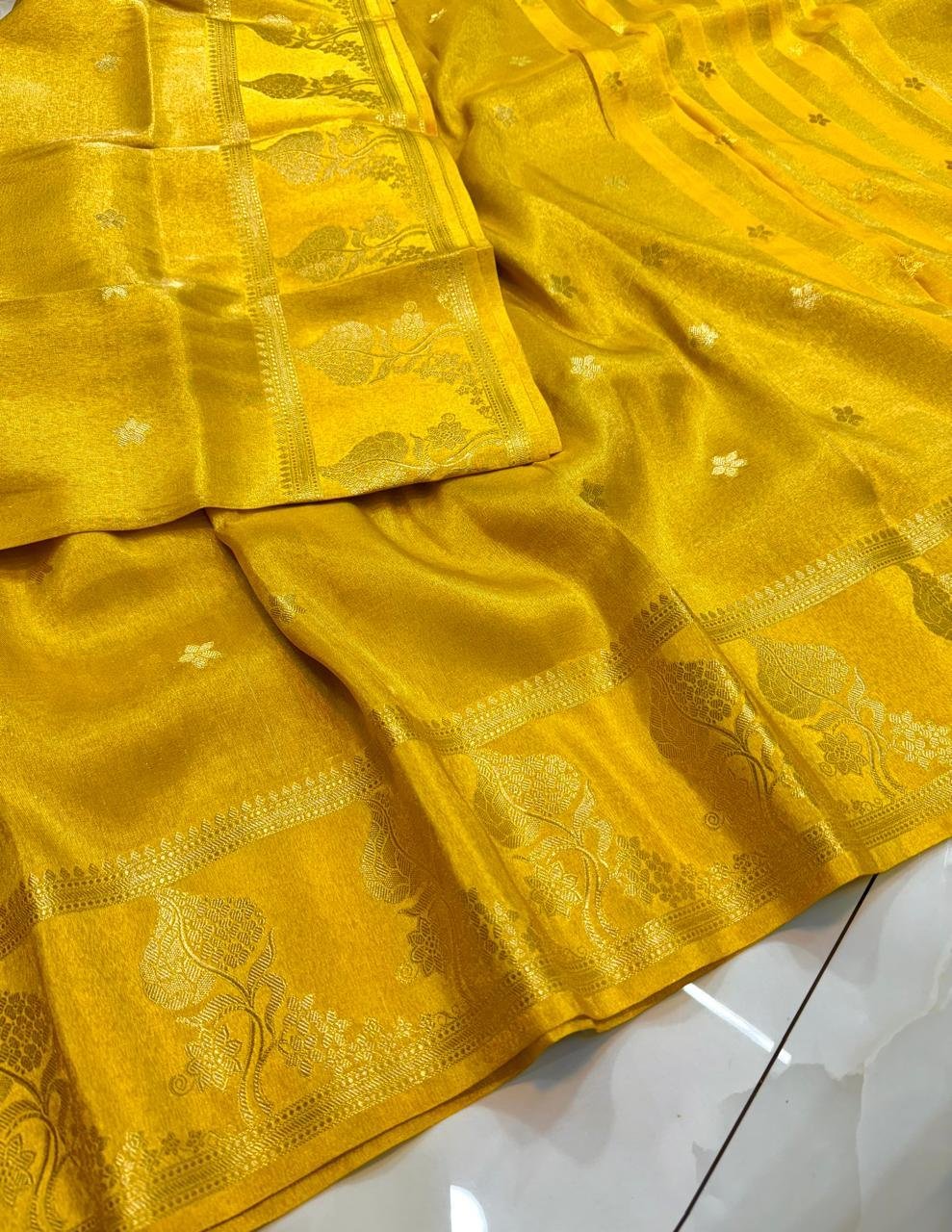 Elevate your ethnic wardrobe with this stunning handcrafted Banarasi saree in a vibrant yellow shade. Made from premium Tissue Silk, the saree features intricate gold zari work that adds a touch of regal elegance. Perfect for weddings, festivals, or any special occasion, this saree is designed to make you stand out with its luxurious fabric and timeless design. The ensemble includes a matching blouse piece for a complete, seamless look.