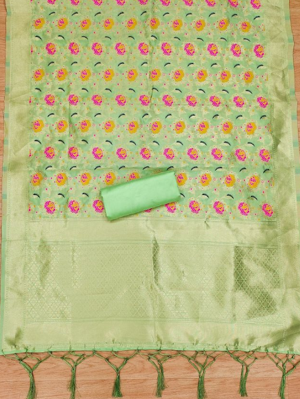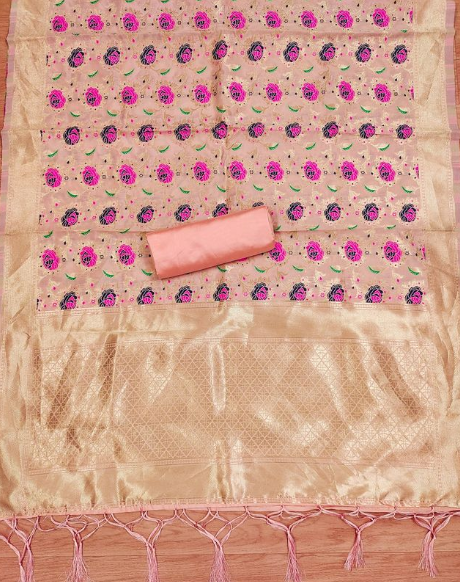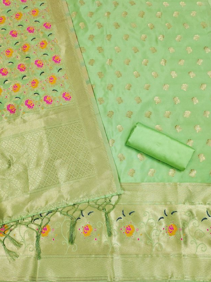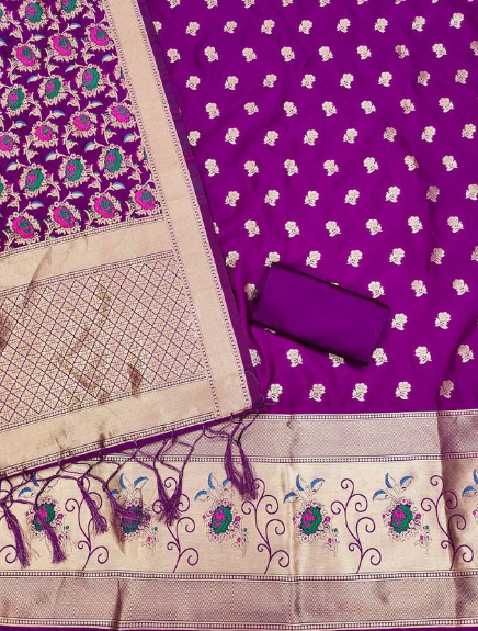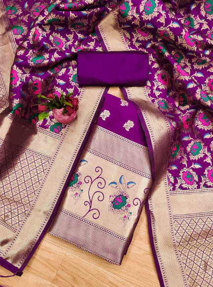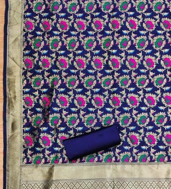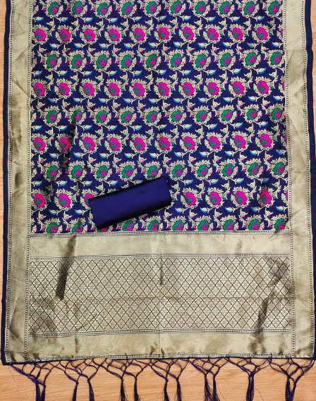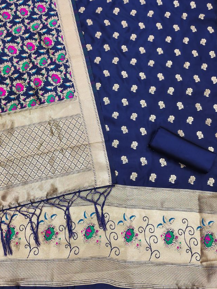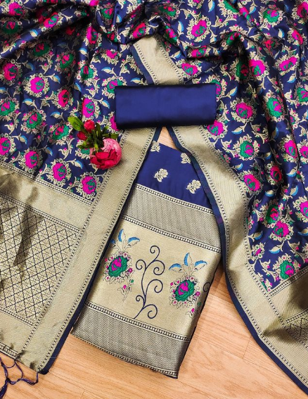 Navy Blue Floral Designer Silk Suit Set with Zari Border