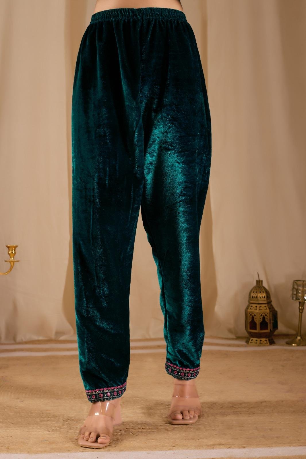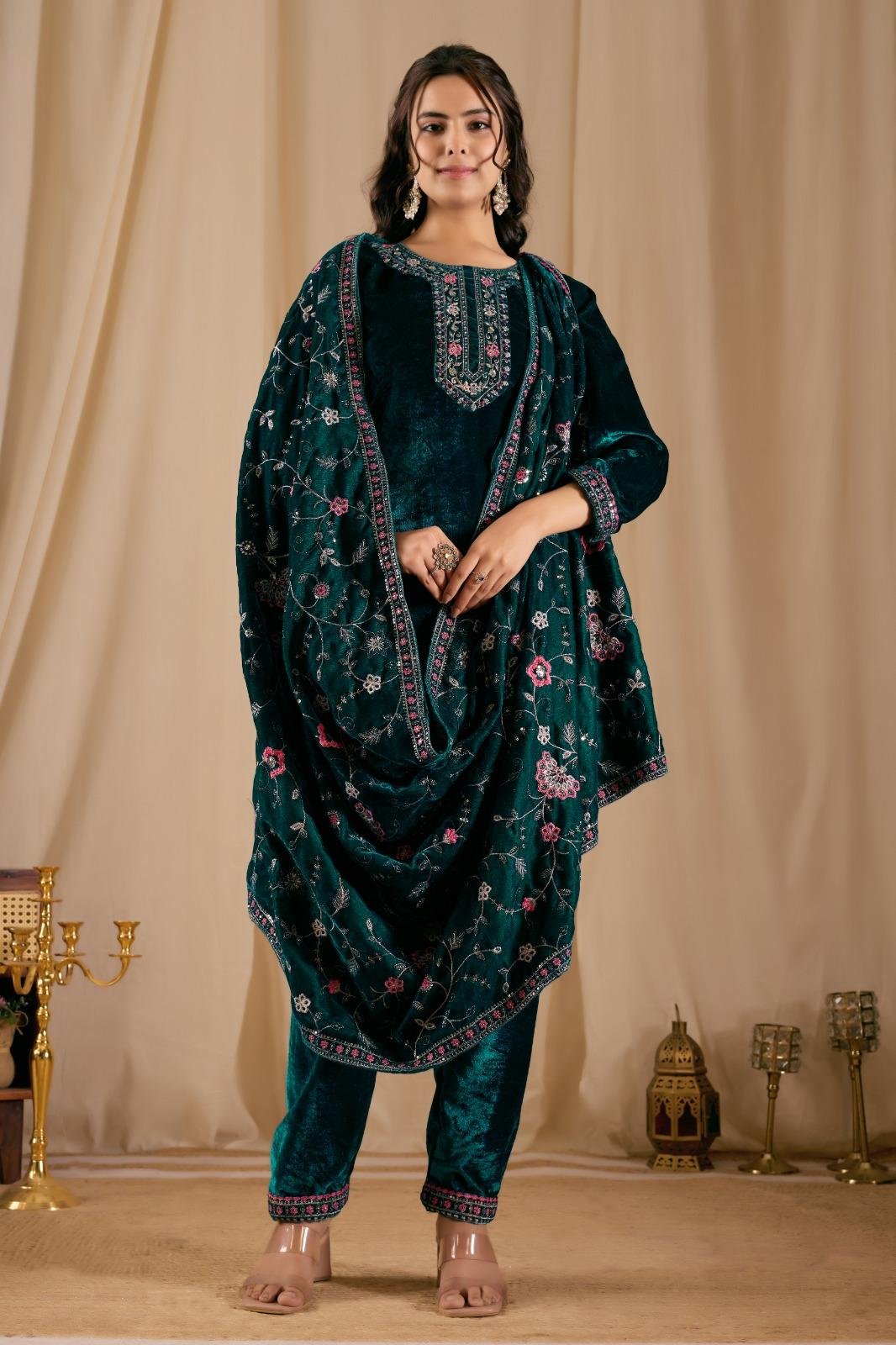 This emerald velvet embroidered suit set is the perfect blend of tradition and luxury. Featuring delicate floral detailing and a statement dupatta, it’s made for festive evenings and special celebrations.