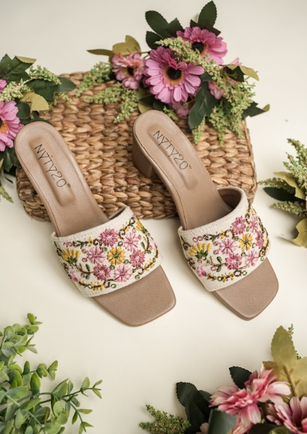 These elegant slip-on sandals feature a soft beige sole paired with a beautifully embroidered strap adorned with delicate pink floral patterns and subtle bead accents. Designed for both comfort and style, the open-toe silhouette makes them perfect for casual outings, summer gatherings, or relaxed festive wear. The cushioned footbed ensures ease with every step, while the intricate floral detailing adds a charming, feminine touch to any outfit.