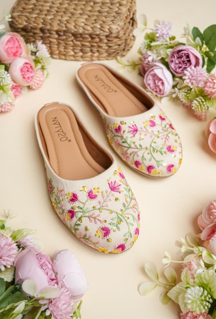 These elegant slip-on mules feature a soft, neutral base adorned with delicate multicolored floral embroidery, creating a fresh and feminine look. The intricate stitching includes pink blossoms, green vines, and subtle yellow accents, giving the shoes a handcrafted, spring-inspired charm. Designed with a closed toe and open back, they offer both comfort and effortless wear.