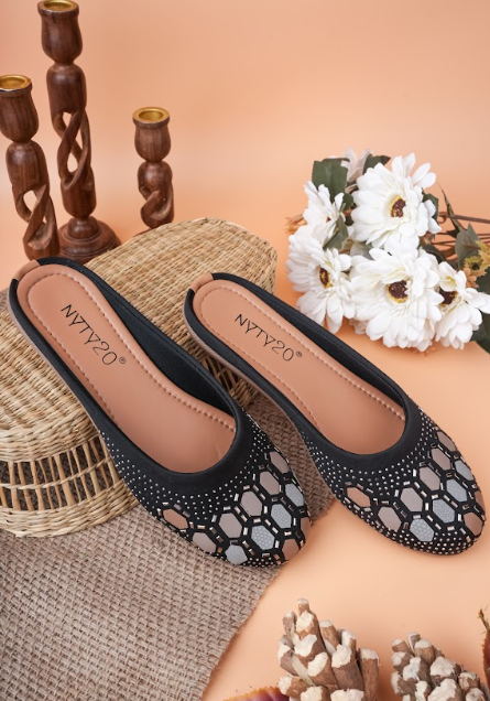 These elegant slip-on mules feature a soft, neutral base adorned with delicate multicolored floral embroidery, creating a fresh and feminine look. The intricate stitching includes pink blossoms, green vines, and subtle yellow accents, giving the shoes a handcrafted, spring-inspired charm. Designed with a closed toe and open back, they offer both comfort and effortless wear.