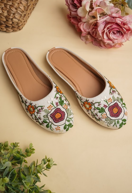 These elegant slip-on mules feature a soft, neutral base adorned with delicate multicolored floral embroidery, creating a fresh and feminine look. The intricate stitching includes pink blossoms, green vines, and subtle yellow accents, giving the shoes a handcrafted, spring-inspired charm. Designed with a closed toe and open back, they offer both comfort and effortless wear.