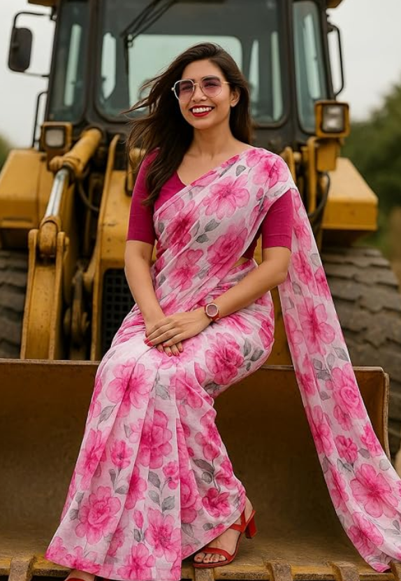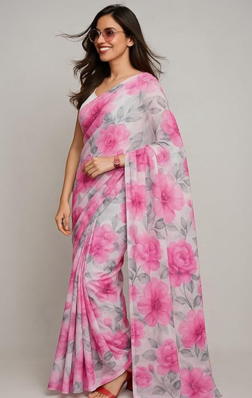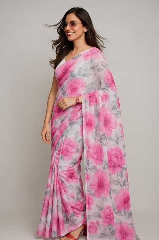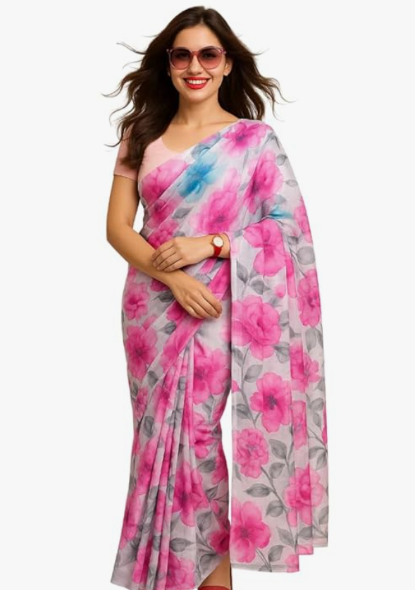 - FLORAL DESIGN: Elegant saree featuring vibrant pink floral prints with blue accents and grey leaves on a pristine white background