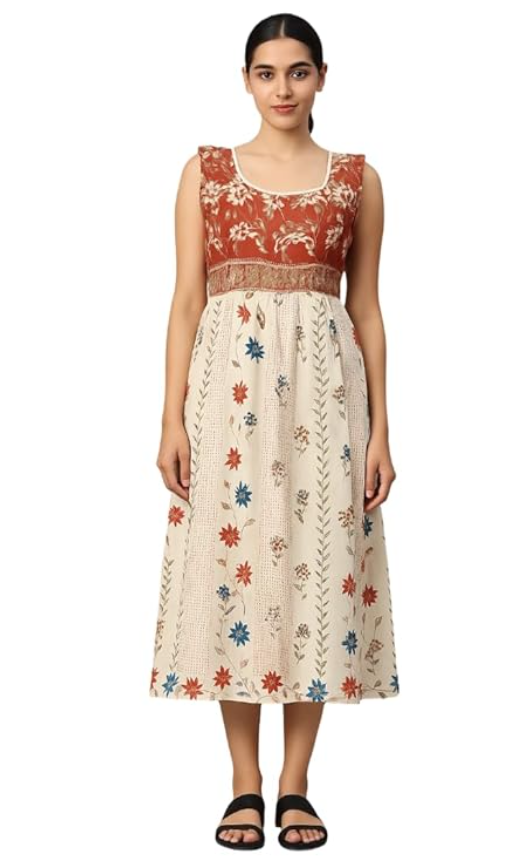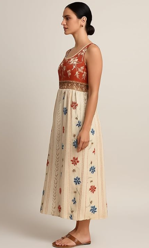 - DESIGN FEATURES: Beautiful floral print midi dress with a unique two-tone pattern - rust-coloured bodice with white flowers and cream skirt with multicoloured floral design