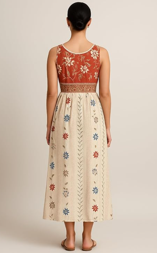 Floral Print Cotton Midi Dress, Sleeveless Empire Waist, Rust and Cream with Blue Accents Size 2 XL Georgette with Heavy Astra
