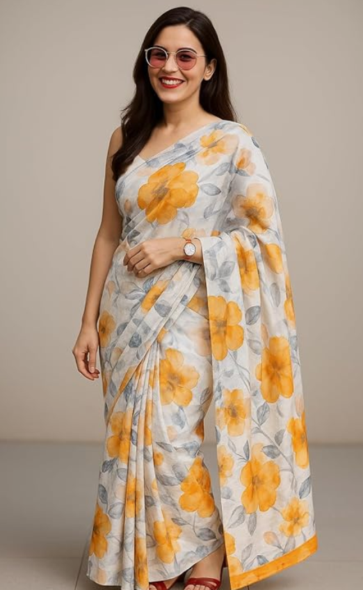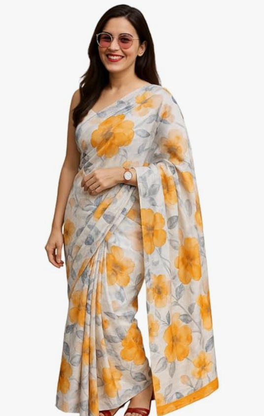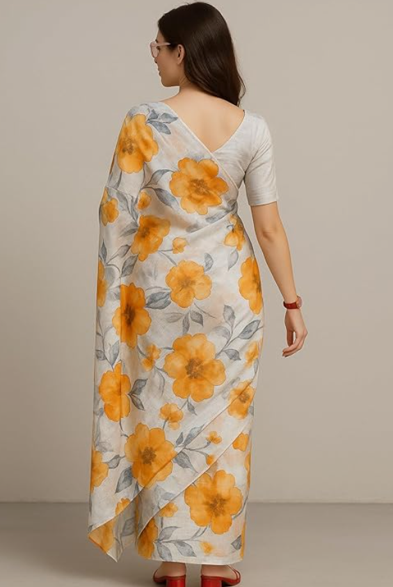 - ELEGANT DESIGN: Beautiful floral printed saree featuring vibrant yellow blooms and grey foliage on a pristine white background for a sophisticated look