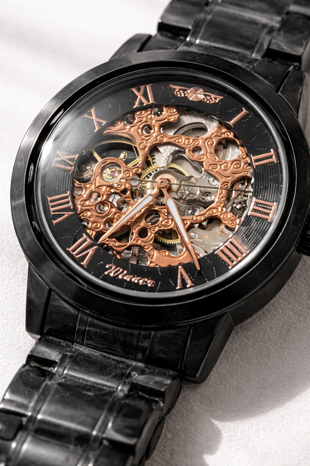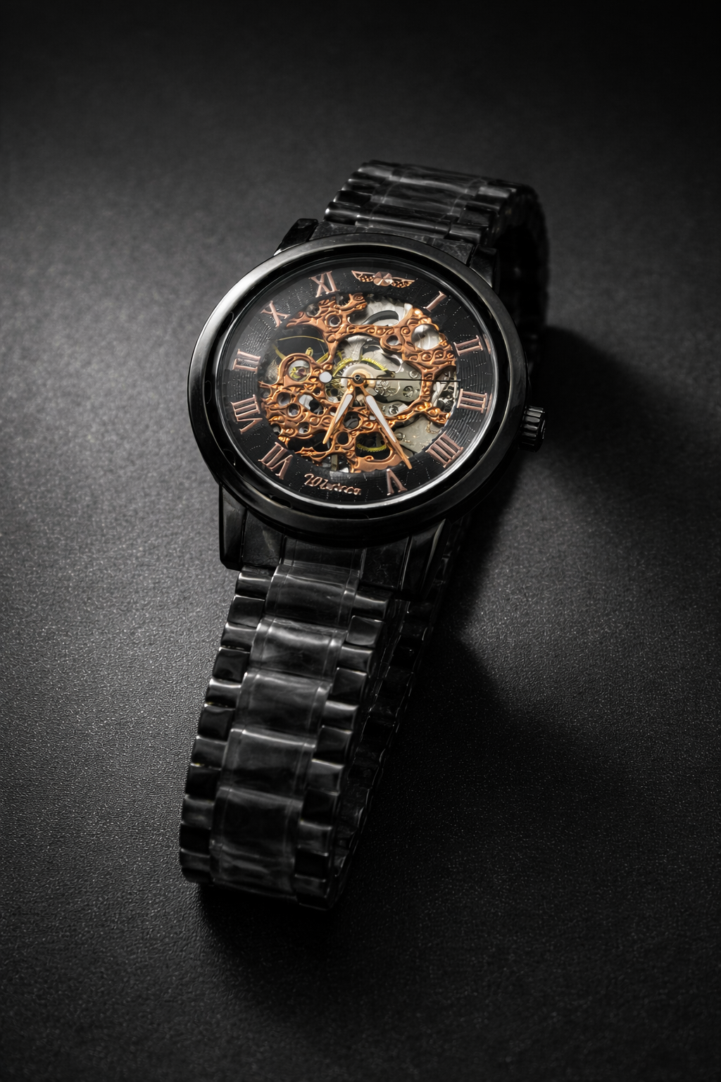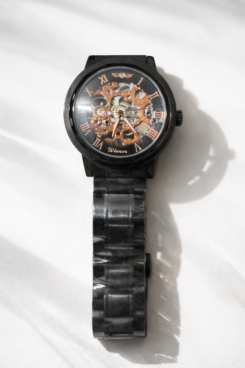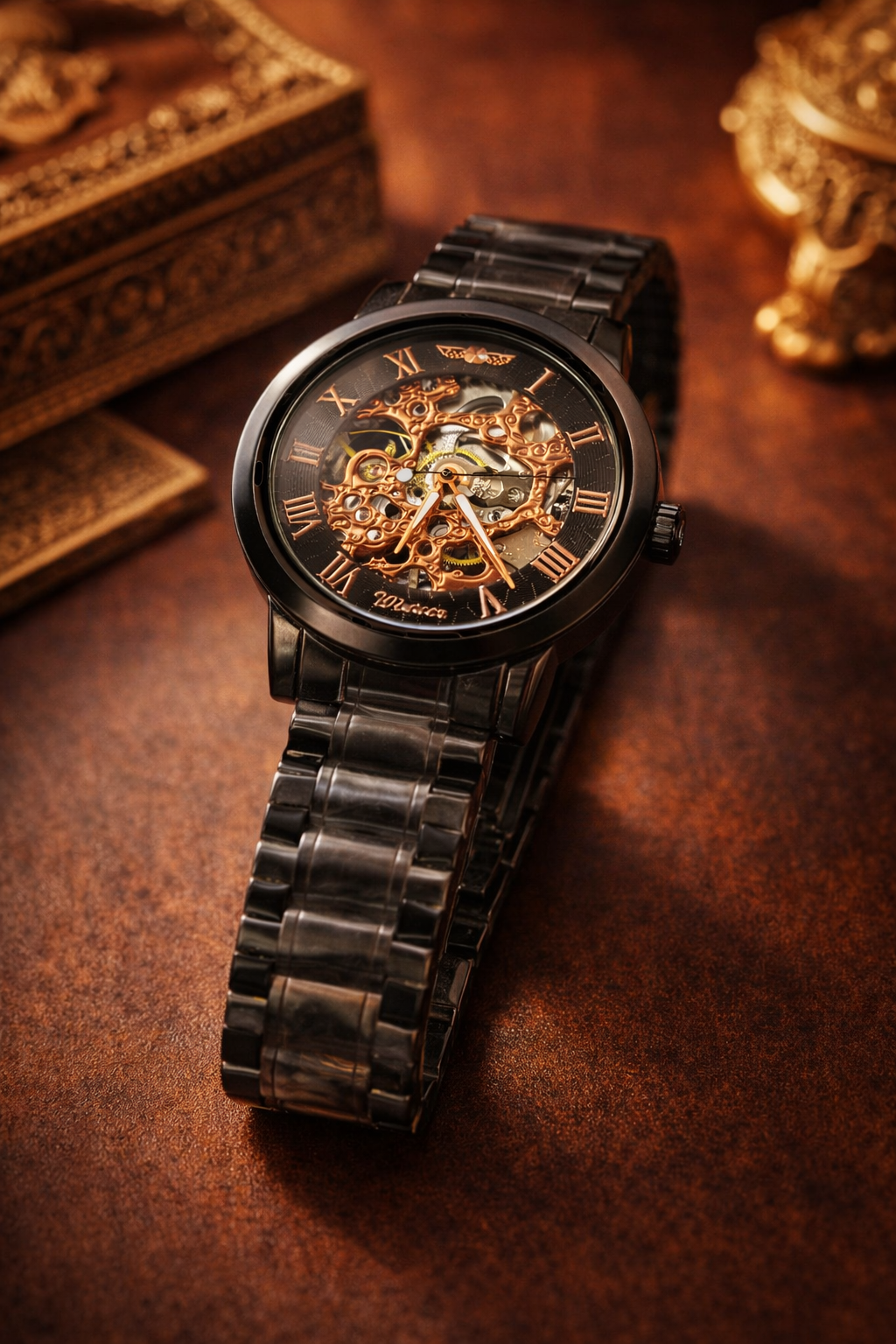 Unlike quartz watches, this mechanical timepiece allows you to see the heart of the watch in action. The exposed working gears on the dial and the transparent case back showcase the intricate movement, where each component works in perfect harmony. This is not just a watch—it is a living mechanical system, constantly in motion.