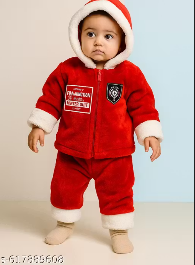 Fun Junction Winter Suit for Infants, Red Hooded Snowsuit with Fur Trim, Warm Fleece Holiday Outfit