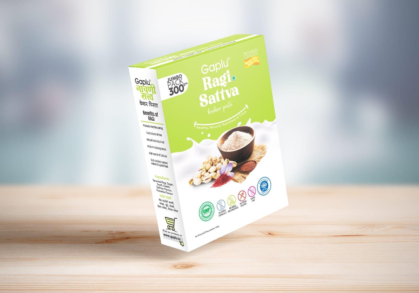 Ingredients: Sprouted ragi, sugar, sunth (ginger), elaichi (cardamom), saffron flavor, and pistachio flavor.