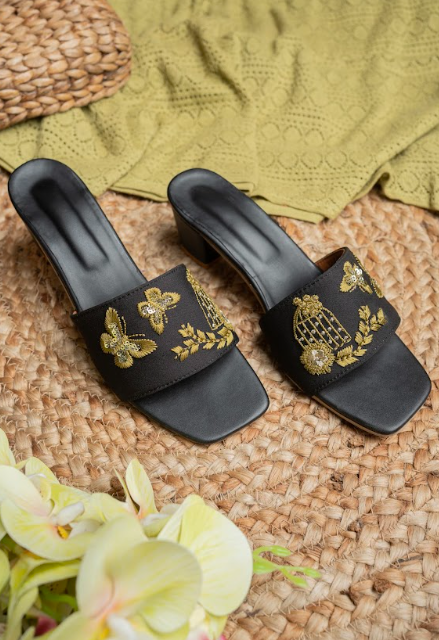 Garden Noir Embroidered Block Heel Slides