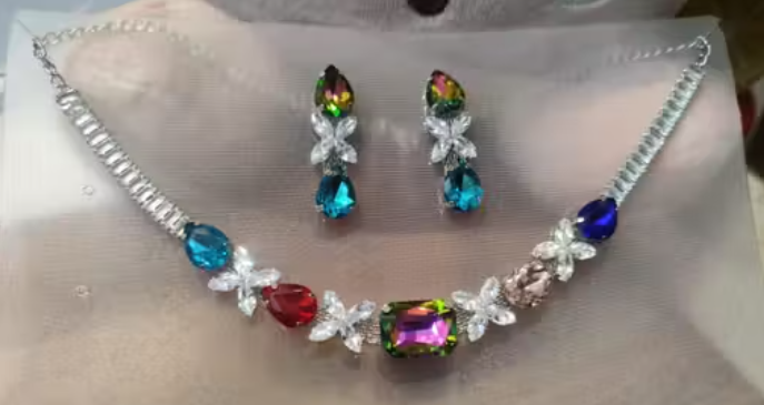 Glass Stone Multicolored Party Wear Necklace With Stylish Earing
