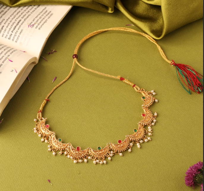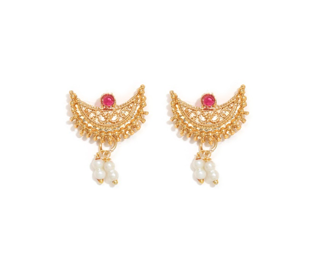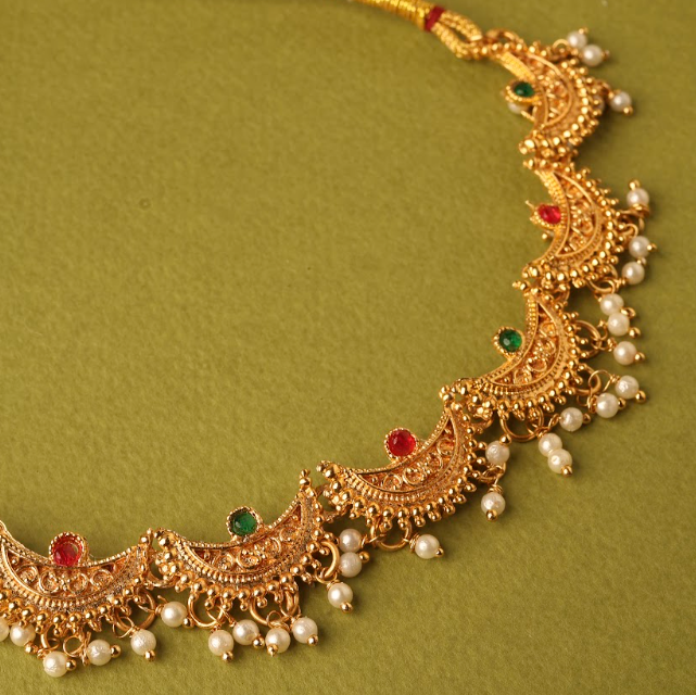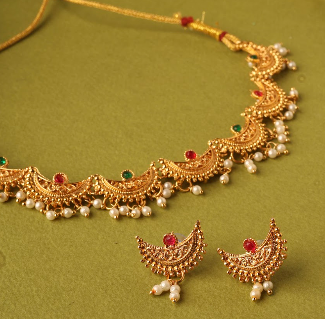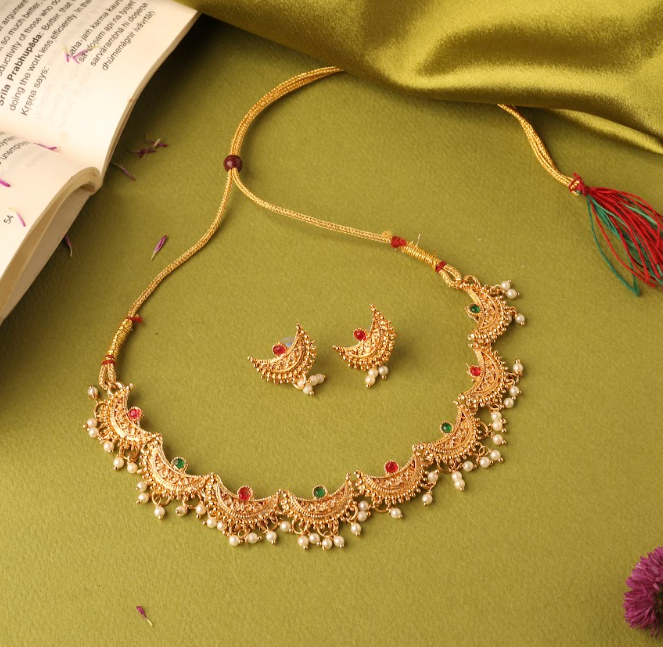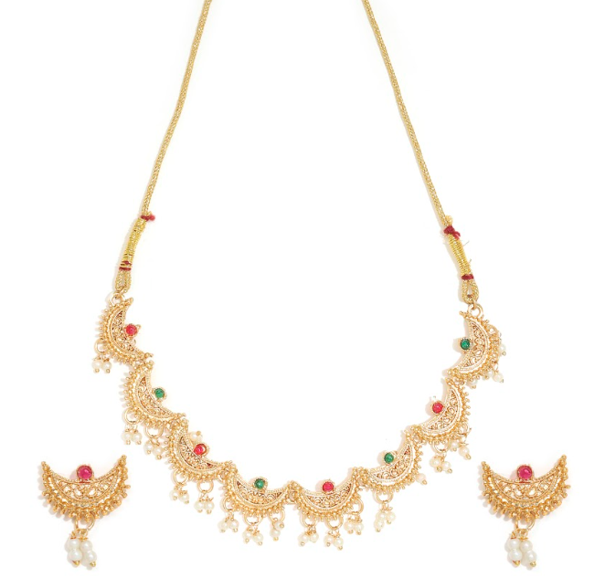 Add royal elegance to your traditional look with this Gold-Plated Chandrakor Necklace Set, inspired by the classic crescent-moon (Chandrakor) design. Adorned with rich ruby and emerald stones and finished with graceful white pearl drops, this set reflects timeless Indian craftsmanship. Perfect for weddings, festive occasions, and cultural celebrations, it pairs beautifully with sarees, lehengas, and ethnic outfits. Lightweight yet luxurious, it offers comfort along with a regal appeal.