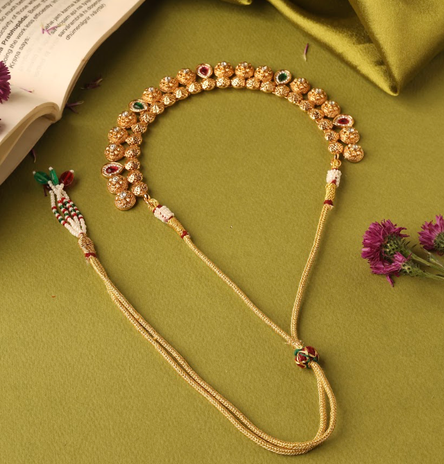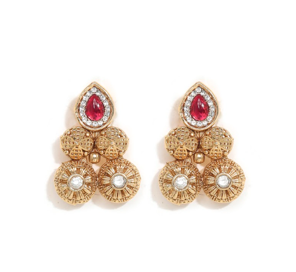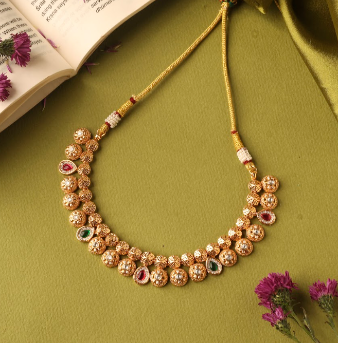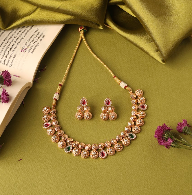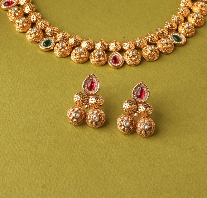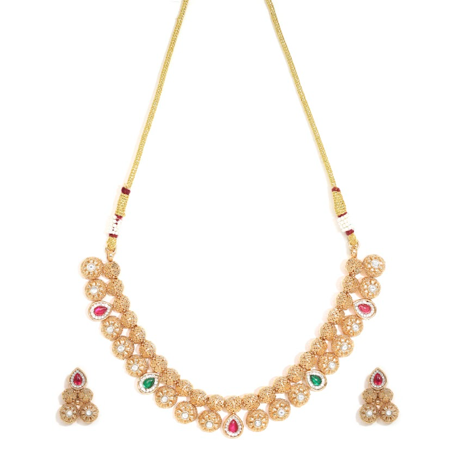 Add a touch of elegance and festive charm with this Gold-Plated Copper Alloy Necklace and Earring Set, adorned with vibrant red and green stones. Crafted from durable copper alloy with a luxurious gold finish, this set offers a striking traditional look perfect for weddings, festivals, and special occasions. Lightweight and comfortable to wear, it pairs beautifully with ethnic attire, adding a splash of color and sophistication to your ensemble.