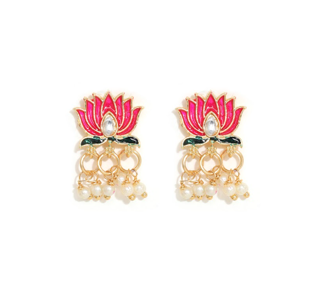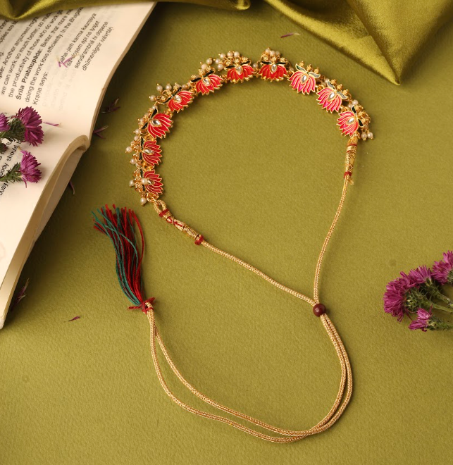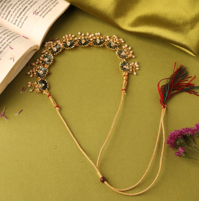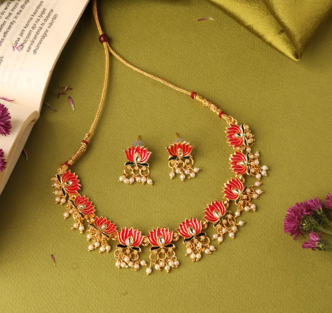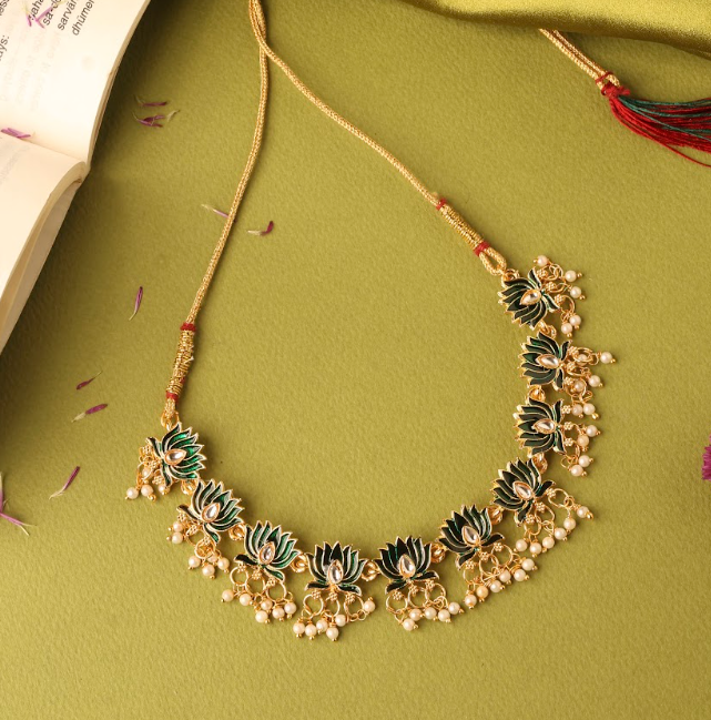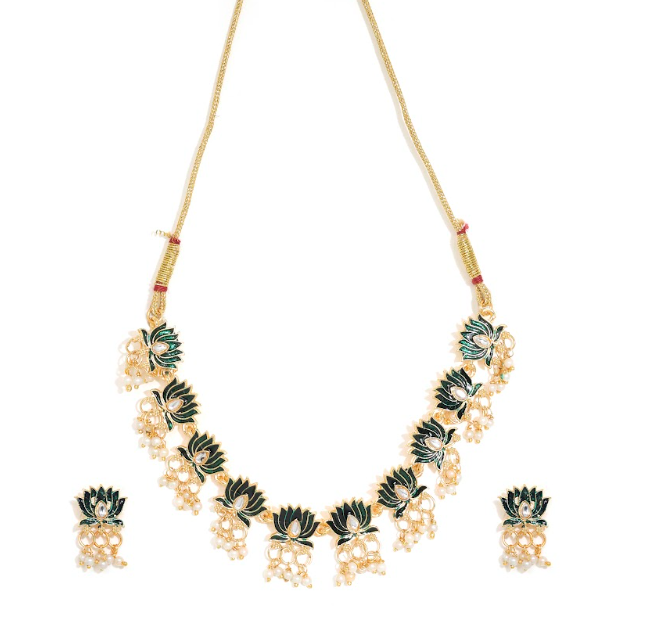 Celebrate timeless elegance with this Gold-Plated Green Enamel Lotus-Motif Necklace and Earring Set, beautifully finished with delicate pearl drops. Inspired by the graceful lotus design, the rich green enamel work paired with a gold-plated finish creates a striking traditional look. Perfect for weddings, festive occasions, temple visits, and cultural events, this set adds sophistication and charm to sarees, lehengas, and ethnic outfits. Lightweight and comfortable, it’s ideal for all-day wear.