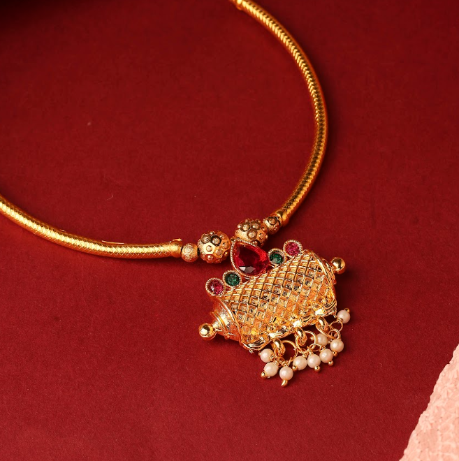 Embrace the timeless elegance of traditional Maharashtrian jewelry with this exquisite Thushi necklace. Crafted in a radiant gold-toned finish, this piece features intricate stone-studded detailing that adds a sparkling charm. The centerpiece is a beautifully designed peacock-motif pendant, symbolizing grace and prosperity, adorned with delicate pearl drops that enhance its royal appeal. Perfect for weddings, festivals, or festive celebrations, this necklace reflects the rich cultural heritage of Maharashtra while making a stunning style statement.