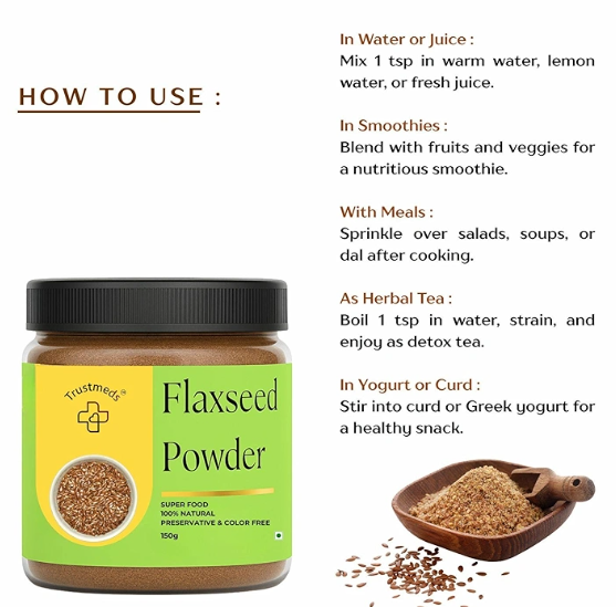 Trustmeds Ground Flaxseed Powder is a natural ingredient suitable for mixing with cereals, smoothies, and baked goods