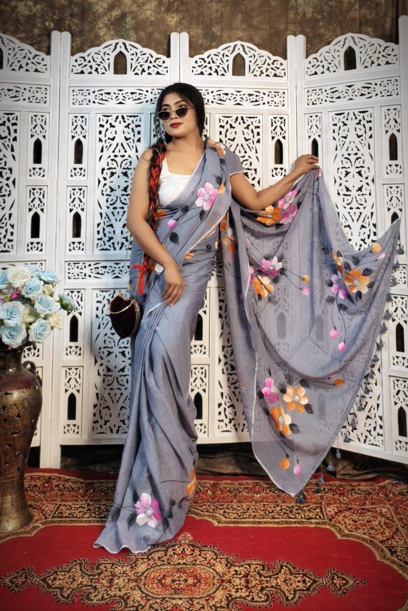 Add a splash of artistry to your wardrobe with this elegant hand-painted saree, crafted from soft and breathable pure mul cotton. Drenched in a soothing baby pink hue, this free-size saree features beautifully hand-painted floral designs in vibrant shades of red, dark pink, orange, and yellow, accentuated with green leaves and delicate stems. The fluid drape and airy texture make it an ideal choice for summer wear, casual gatherings, or artistic celebrations.
