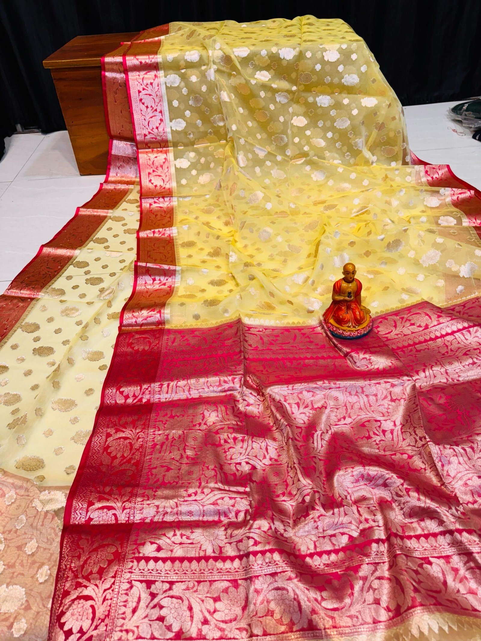 Color Harmony: The body of the saree is a soft butter yellow, sheer with a gentle luster, decorated with delicate repeating gold buttas that shimmer with elegance.