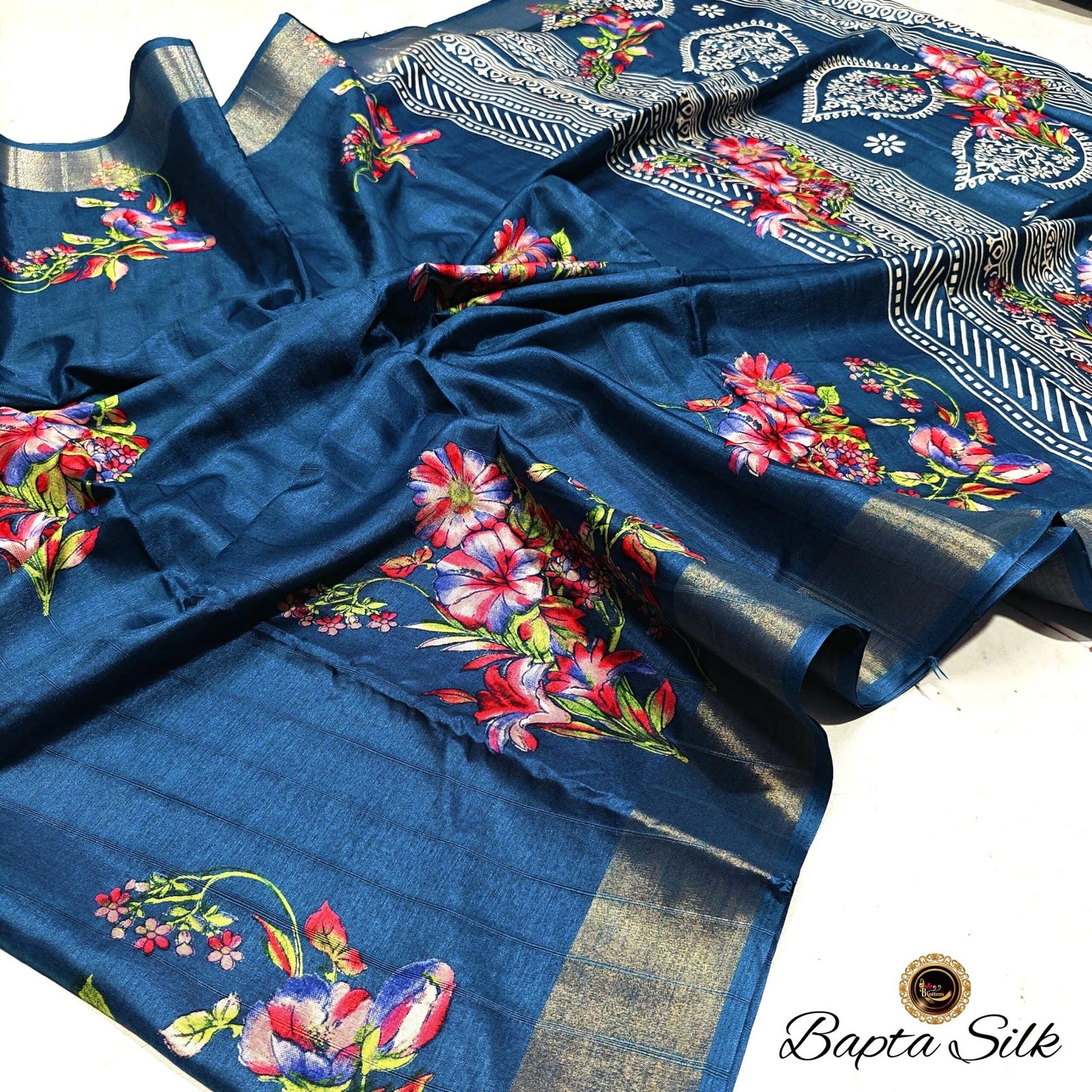 Handcrafted Deep Teal Blue Bapta Silk Saree with Digital Floral Design & Matching Blouse Piece – Free Size